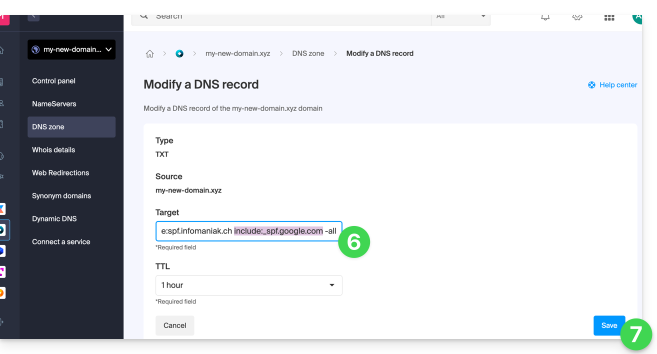 include:_spf.google.comafter the existing Infomaniak include, and this before the final-all. - Click on the Save button: