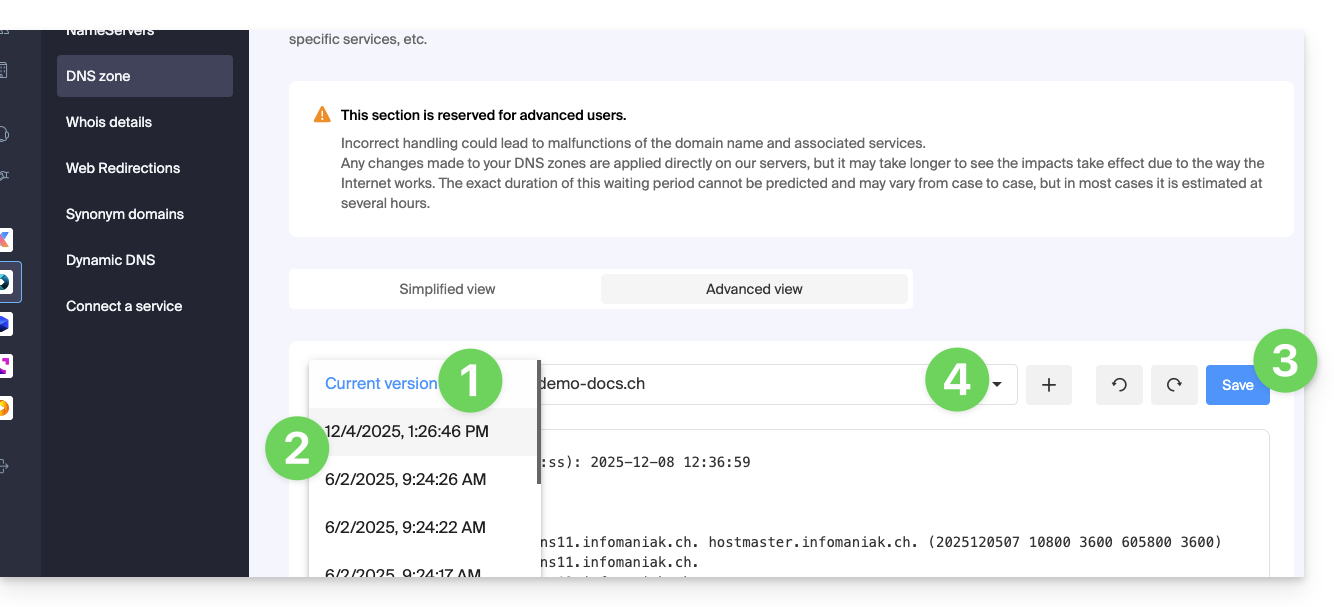 Thanks to the Expert mode, you can use versioning to find a previous version of the DNS zone of your domain name and thus restore it as it was at a given time: