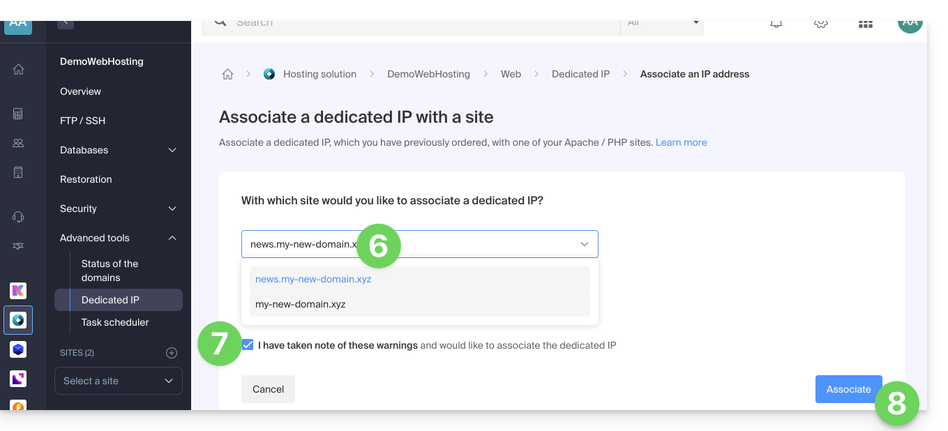 - Click the button to associate the IP with a site on your hosting: