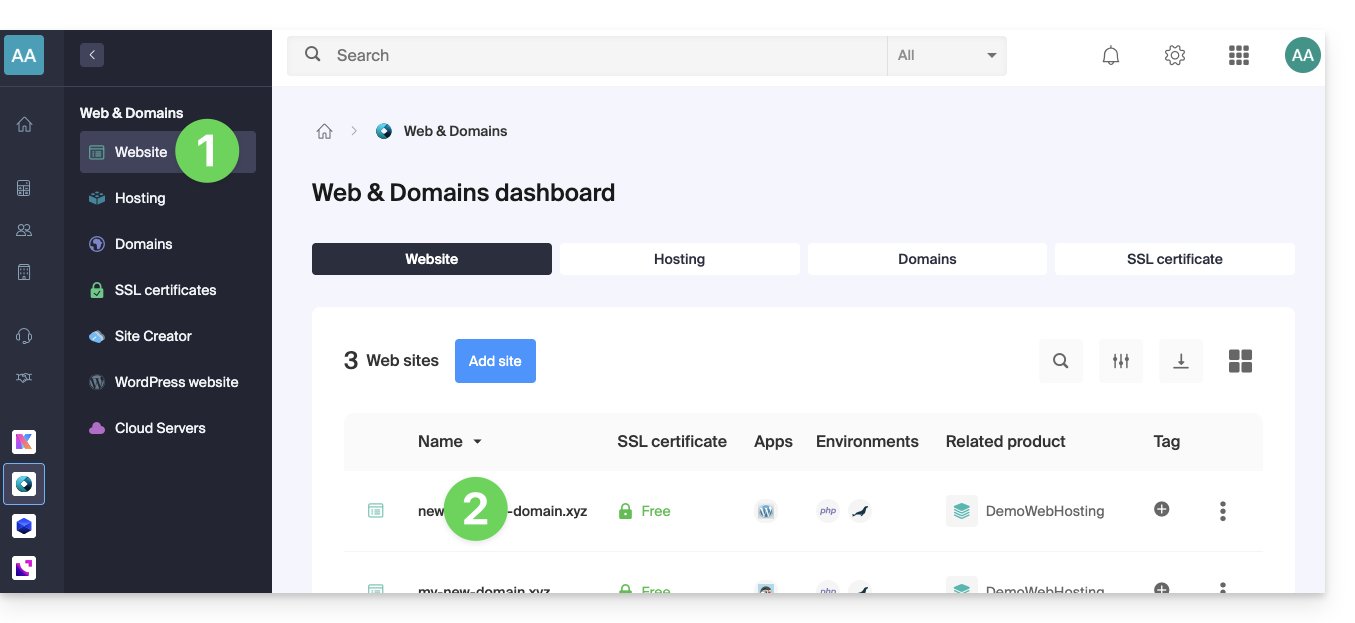 - Click directly on the name assigned to the site concerned.
