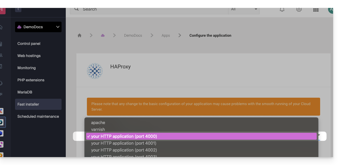 By default, on the Cloud Server, web traffic is sent to Apache. To send requests to a Node script or another service (provided it "listens" on a port between 4000 and 4009), you need to go through HAProxy.