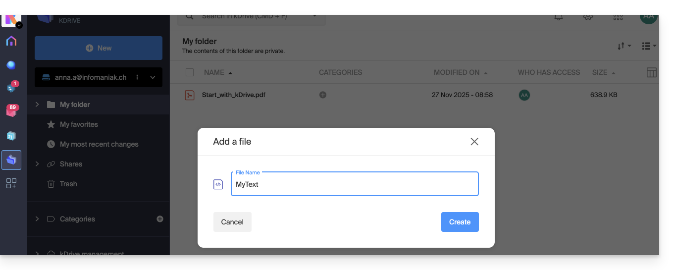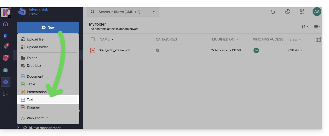This guide explains how to create, save, and edit a simple text file, without any particular formatting (notepad, raw code) on the Web app kDrive (online service ksuite.infomaniak.com/kdrive) using the native editor.