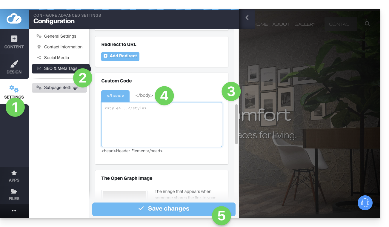 To add JavaScript code or any other code in the HEAD or BODY part of your site's source code: