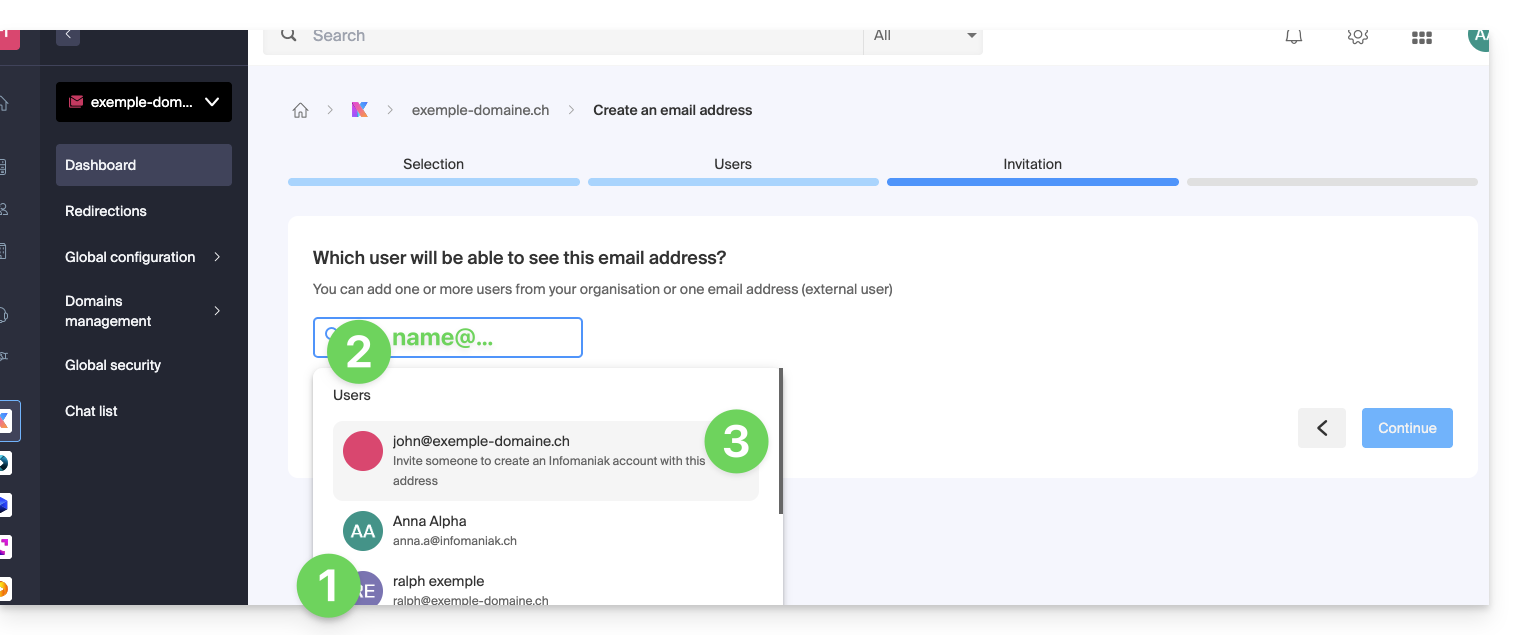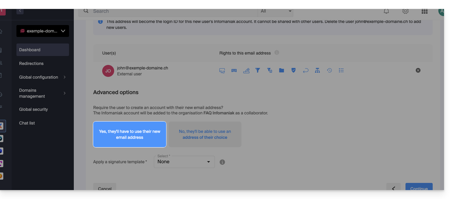 This guide details the principle of an email address created within an Infomaniak Mail Service and the concept of an Infomaniak account user, when the latter uses an Infomaniak email address and consequently some features may be restricted.