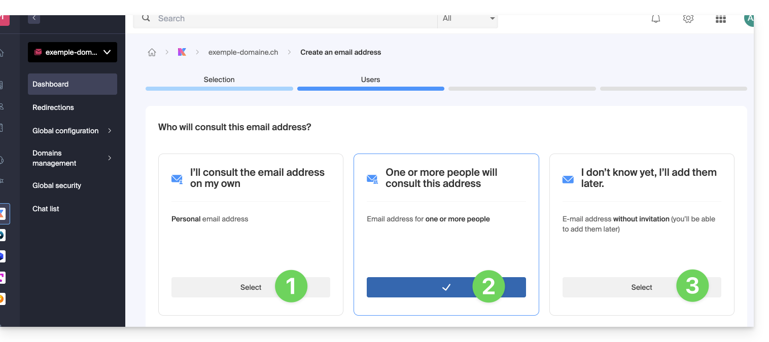 The administrator of a Mail Service creates a new email address (refer to this other guide if necessary) and must select the creation mode suitable for their situation: