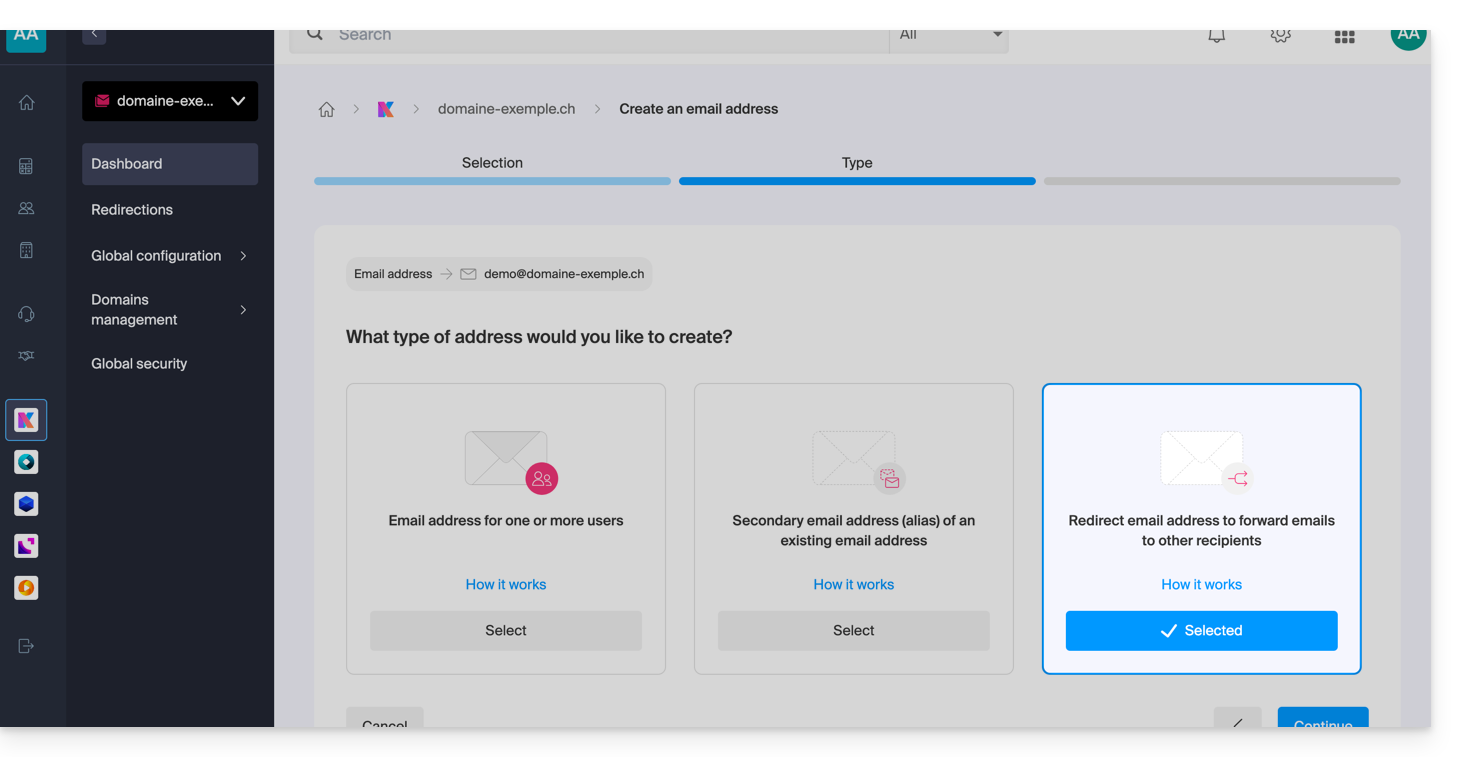 Email redirection is configured directly from the Mail Service in the Infomaniak administration interface (Manager):