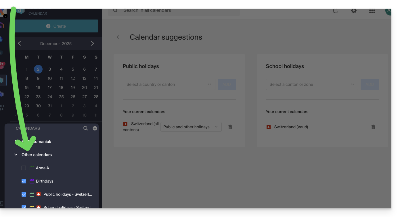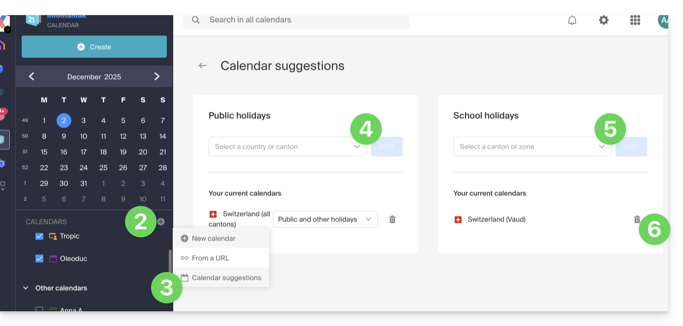 This guide explains how to display a calendar / agenda with the dates of public holidays from the canton or country of your choice on the Infomaniak Web app Calendar (online service ksuite.infomaniak.com/calendar).