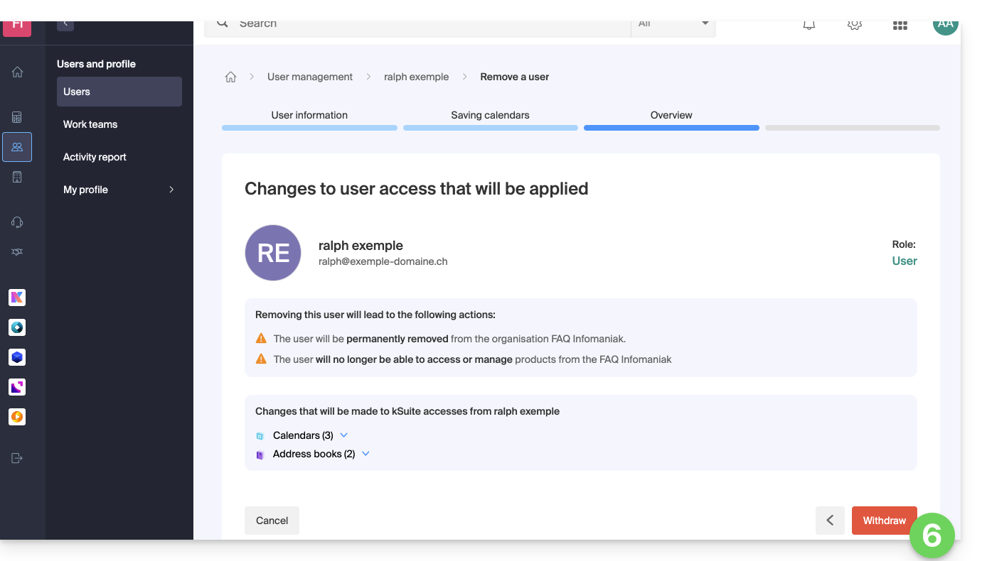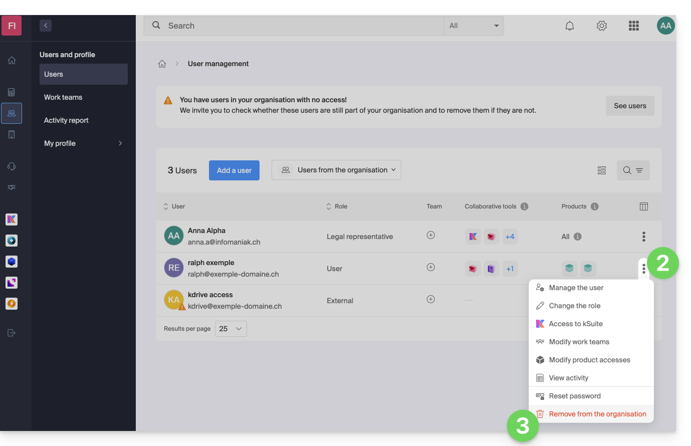 - Check or select the relevant kDrive in the drop-down menu of the left sidebar.