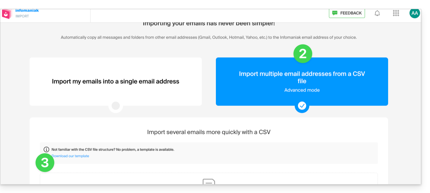 - You can add a profile picture to your Infomaniak account that will replace your initials; it is recommended to import an image of at least 210 pixels on each side: