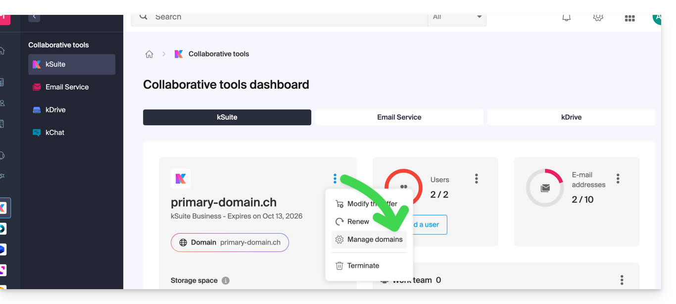 - If a domain is already linked, you can manage it by clicking on the action menu โฎ to the right of the kSuite name, then Manage domains: