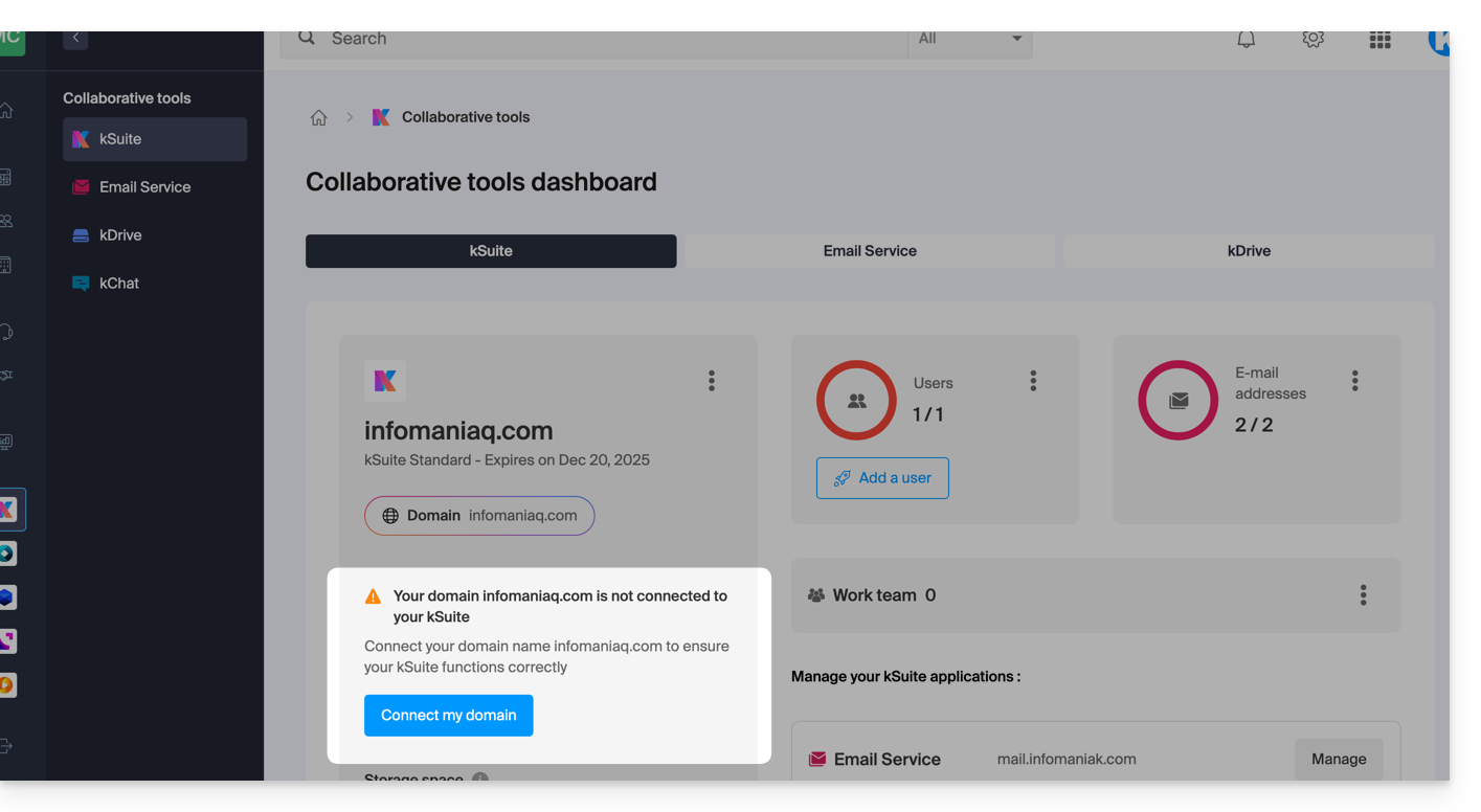 - Click here to access the management of your kSuite on the Infomaniak Manager (need help?).