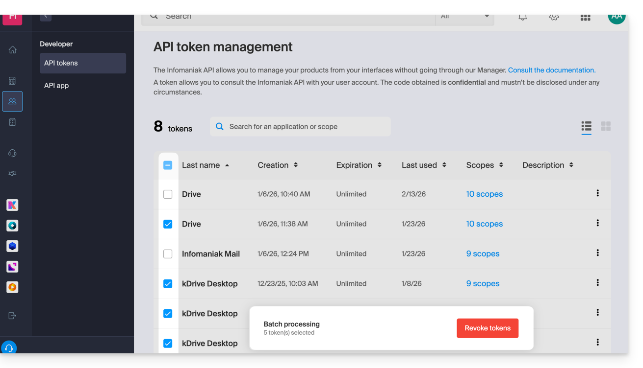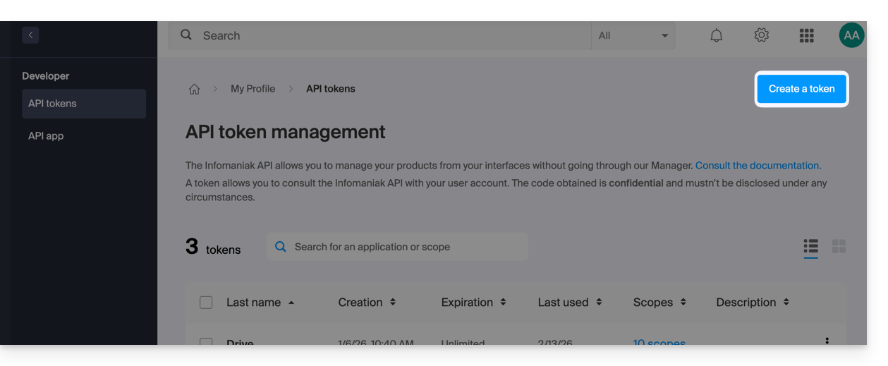 This guide explains how to create and manage your authentication tokens to interact securely with the Infomaniak API.