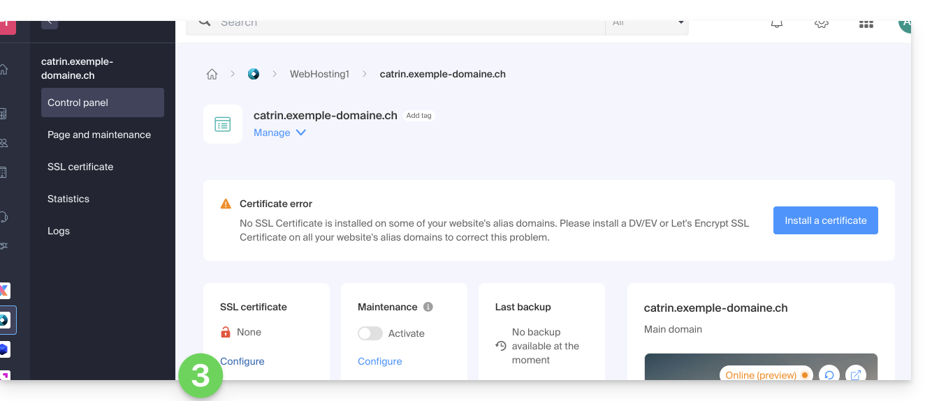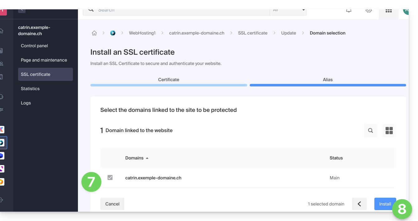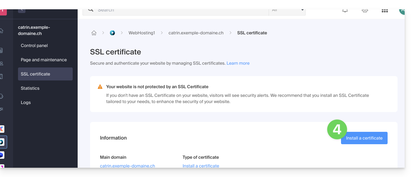 - Click on the blue button Install an SSL certificate and follow the procedure.