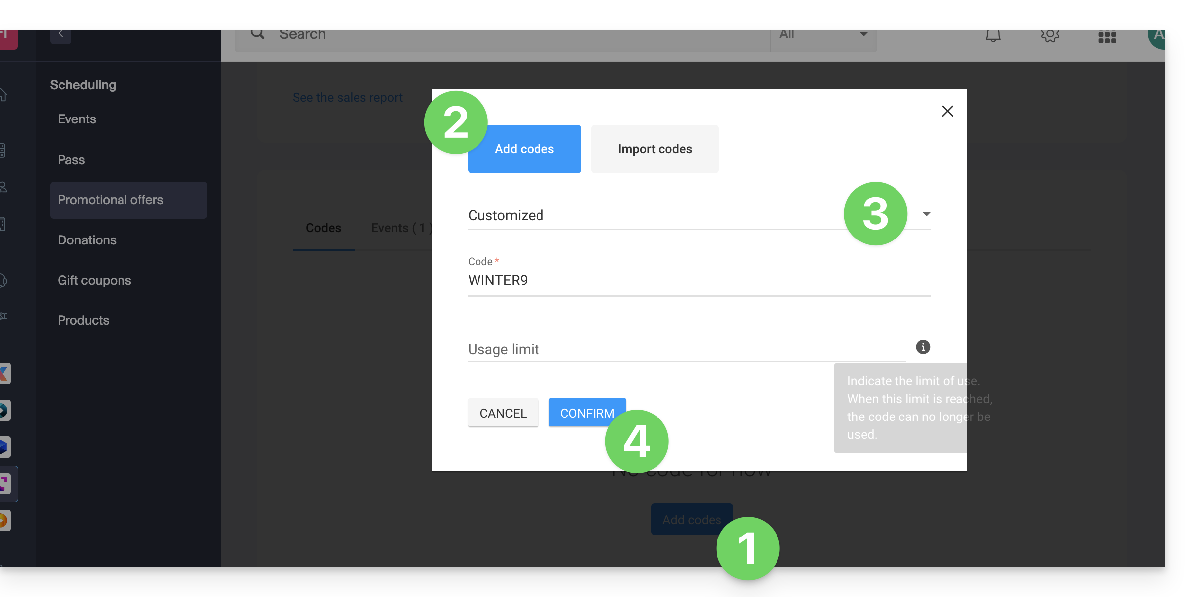 - The maximum number of tickets that can benefit from this offer: once this quota is reached, no promotional code can be validated; practical if you want to give a large number of codes, but only the first X people to arrive can benefit from the offer; note that orders in progress will count in the quota unless the order is canceled in the process.