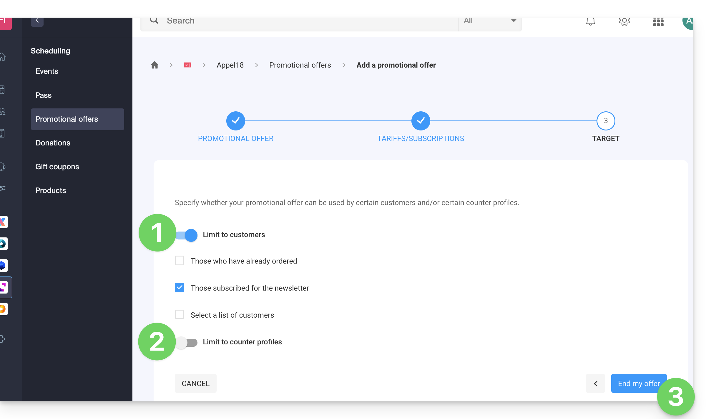 - Limit to certain customers (limit to customers who have already ordered on the ticket office and who are therefore already on the customer list on the ticket office, to those who have subscribed to the newsletter, or to a manually selected customer list…)