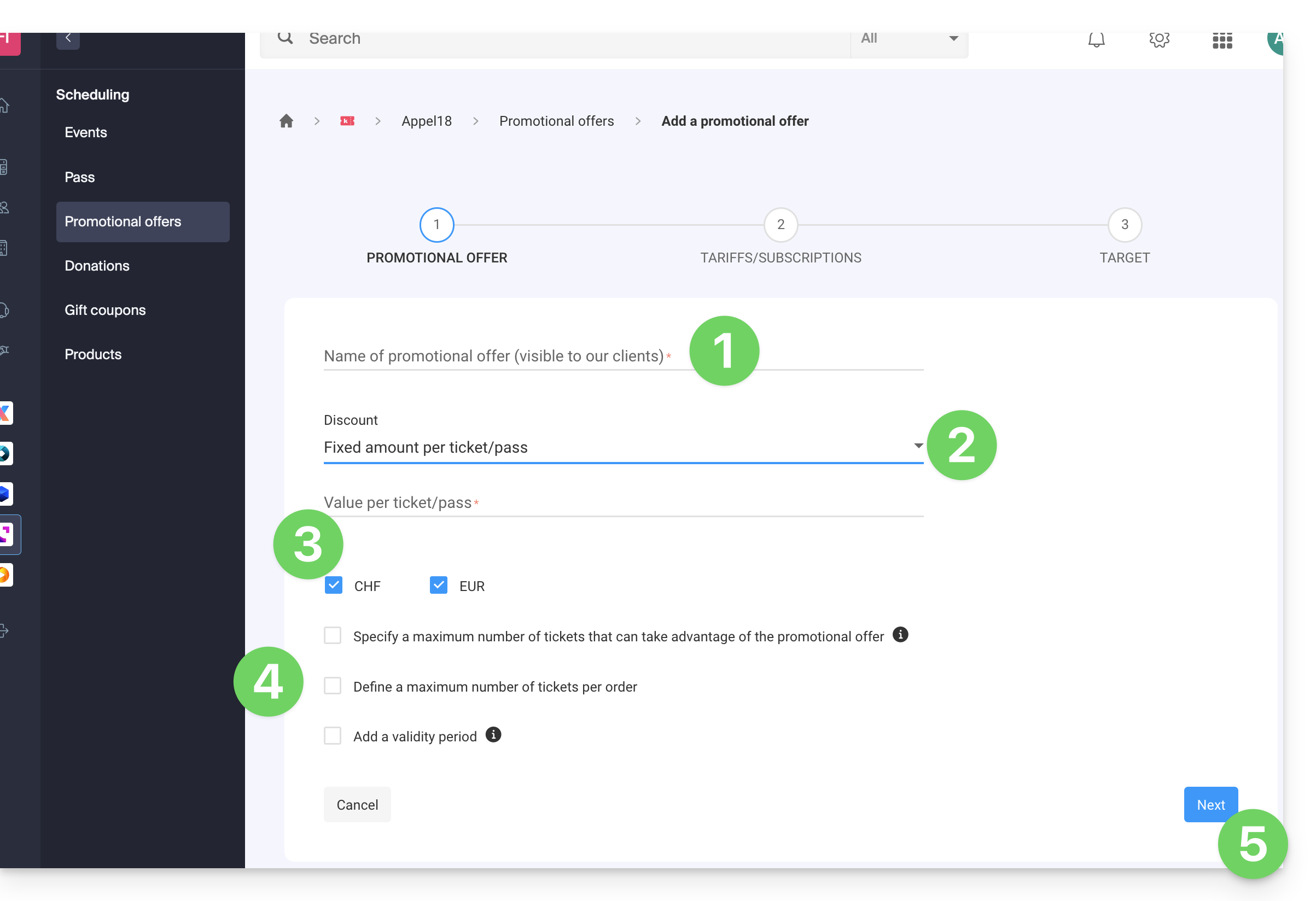 - Specify a name for the offer to be proposed; this name will be visible to the customer when using the promotional code(s).