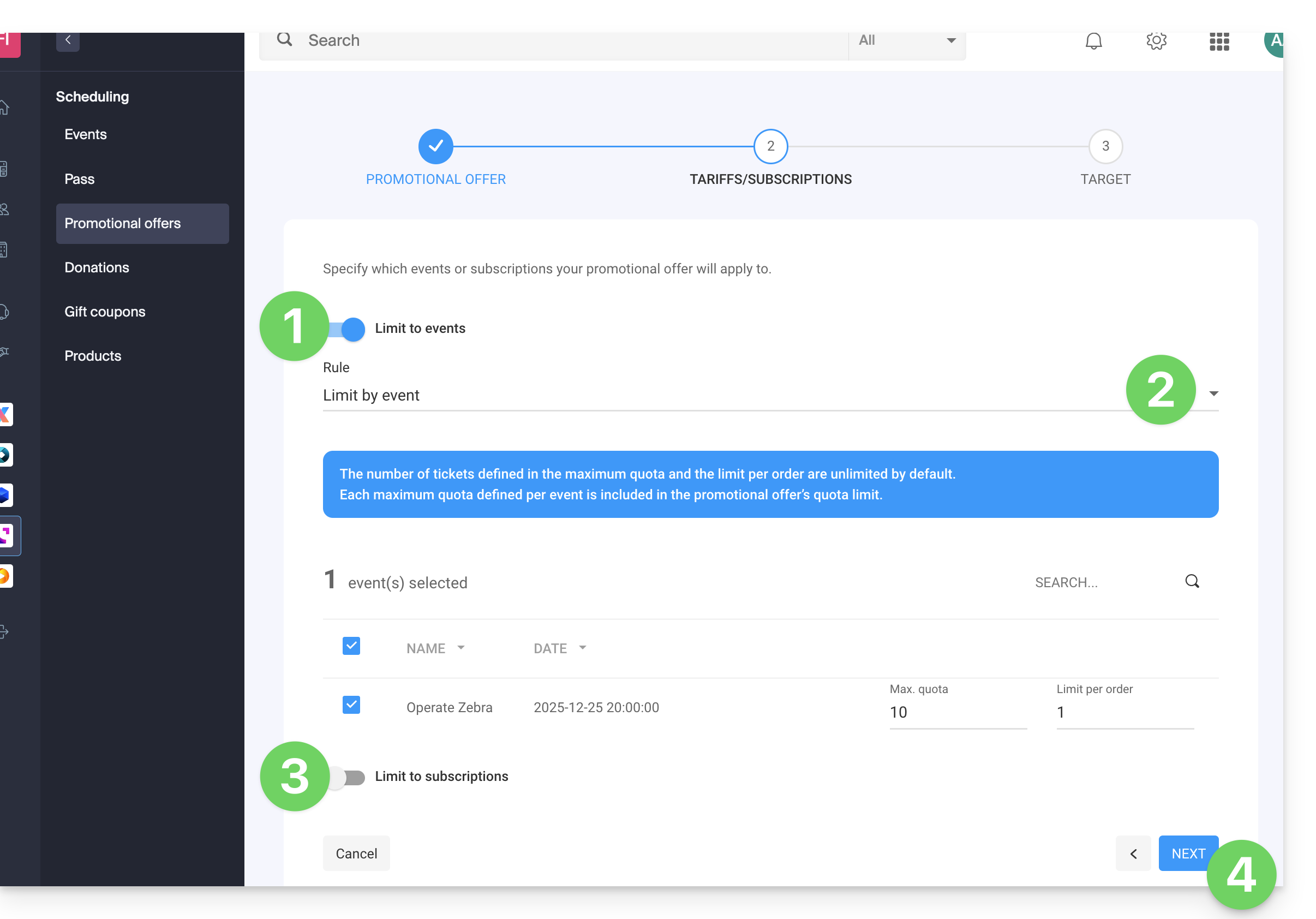 - Each maximum quota defined per event is included in the promotional offer quota limit.