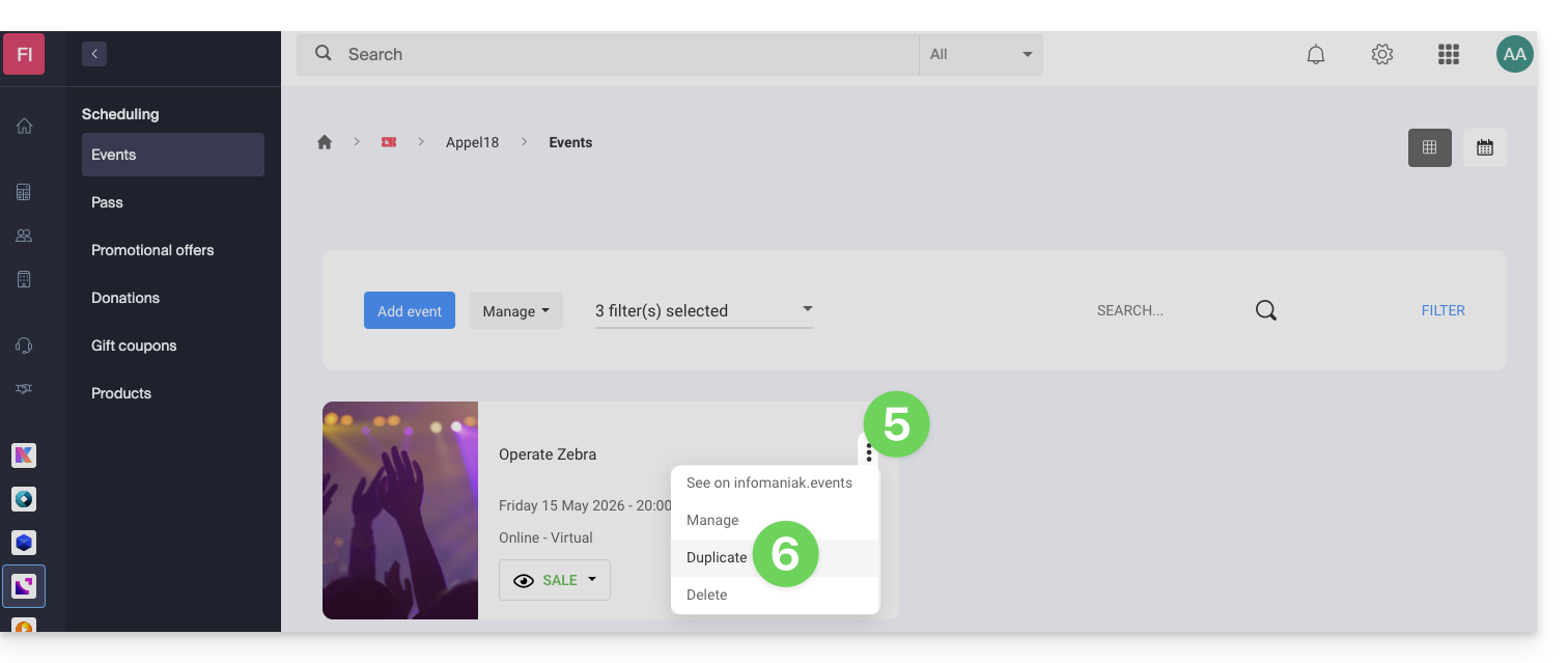 This guide explains how to duplicate an event from one ticket office to another within the framework of the Infomaniak ticketing system.