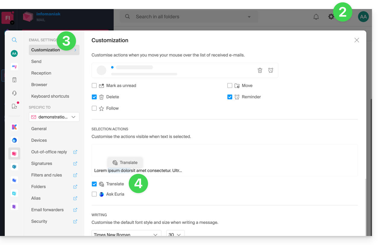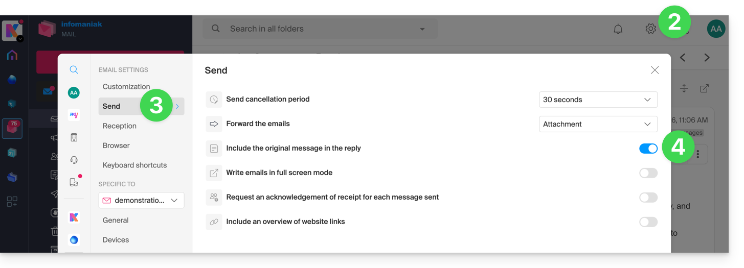 To access the appropriate fields in your Infomaniak mailbox: