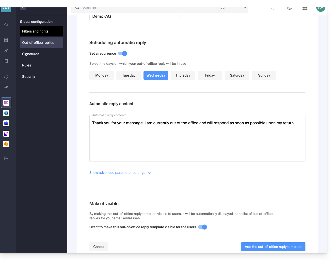 - If the Make visible option is enabled (during creation or also possible afterwards), the rule models created will be suggested to users of email addresses that go to their FILTERS AND RULES section.