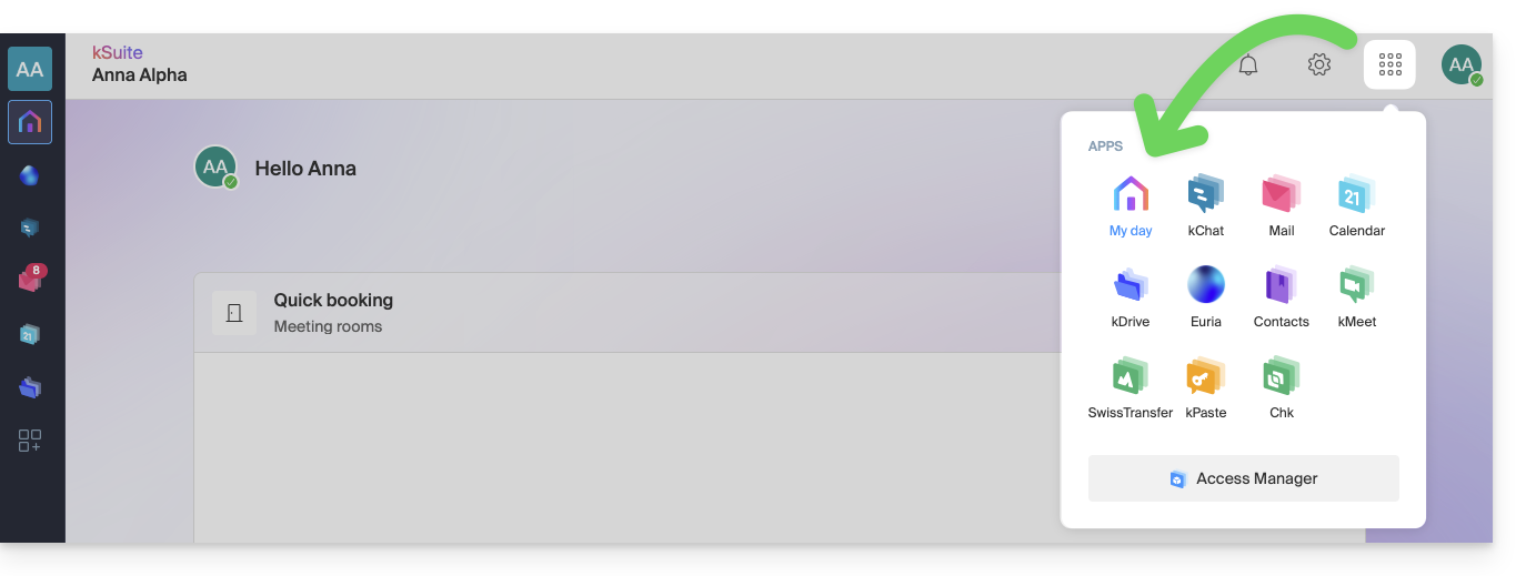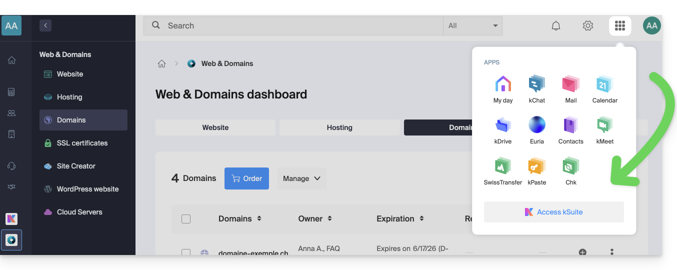 Haga clic en el icono en la parte superior derecha de la interfaz para cambiar entre el Manager de Infomaniak y el espacio kSuite así como las apps kSuite: