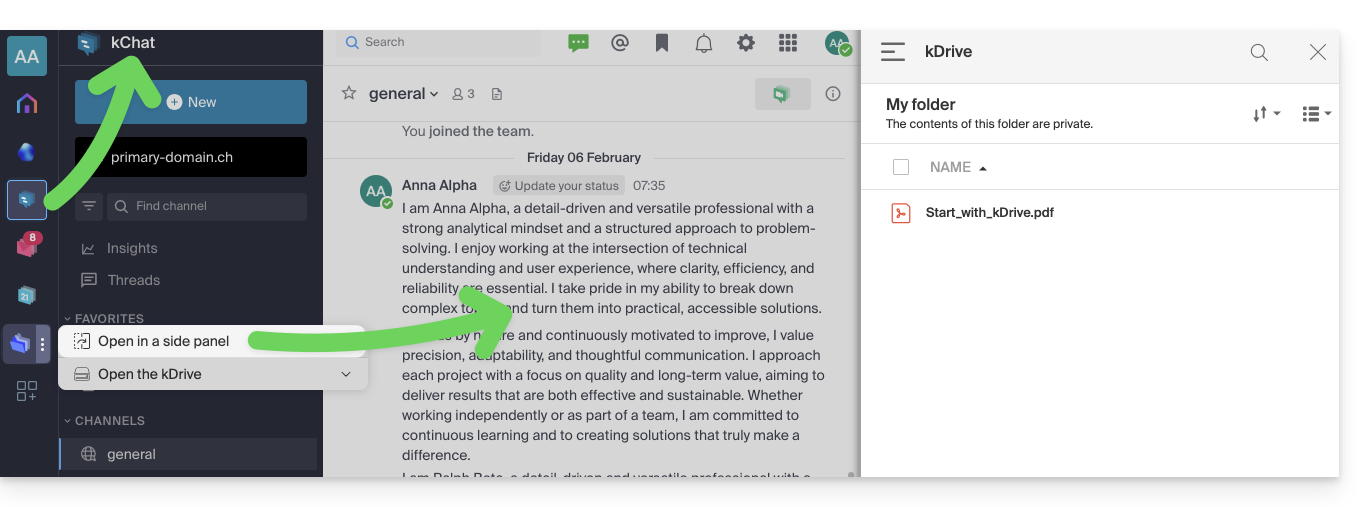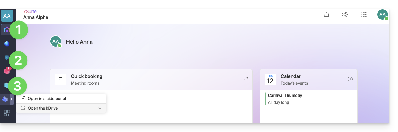 - Haga clic en los iconos del menú lateral izquierdo para acceder a las aplicaciones de la kSuite, como kChat o kDrive.