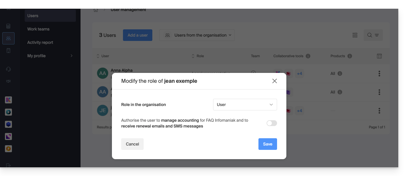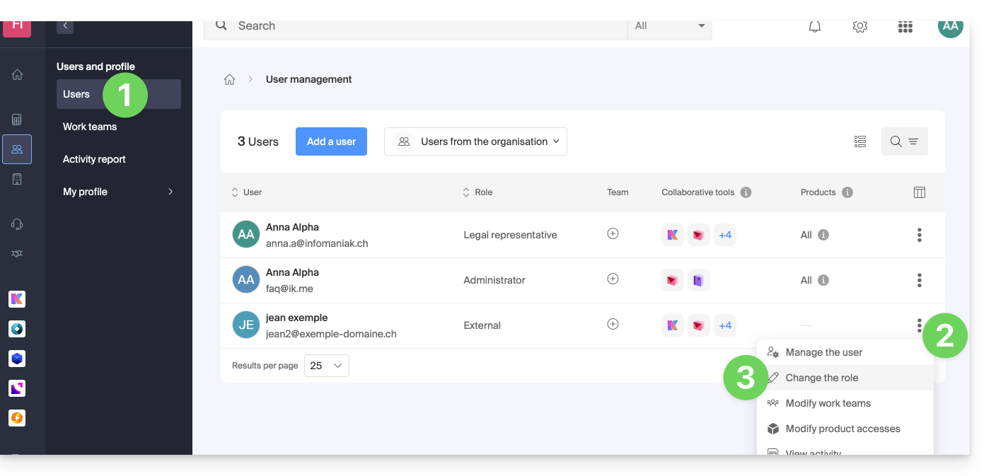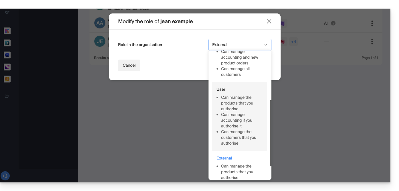 Esta guía explica cómo modificar el rol y los permisos de un usuario para que este último tenga únicamente un rol legal restringido o acceso solo a ciertas funcionalidades de su Organización presente en el Manager de Infomaniak.
