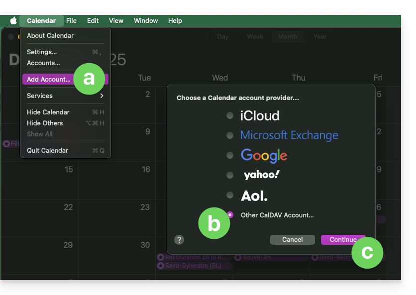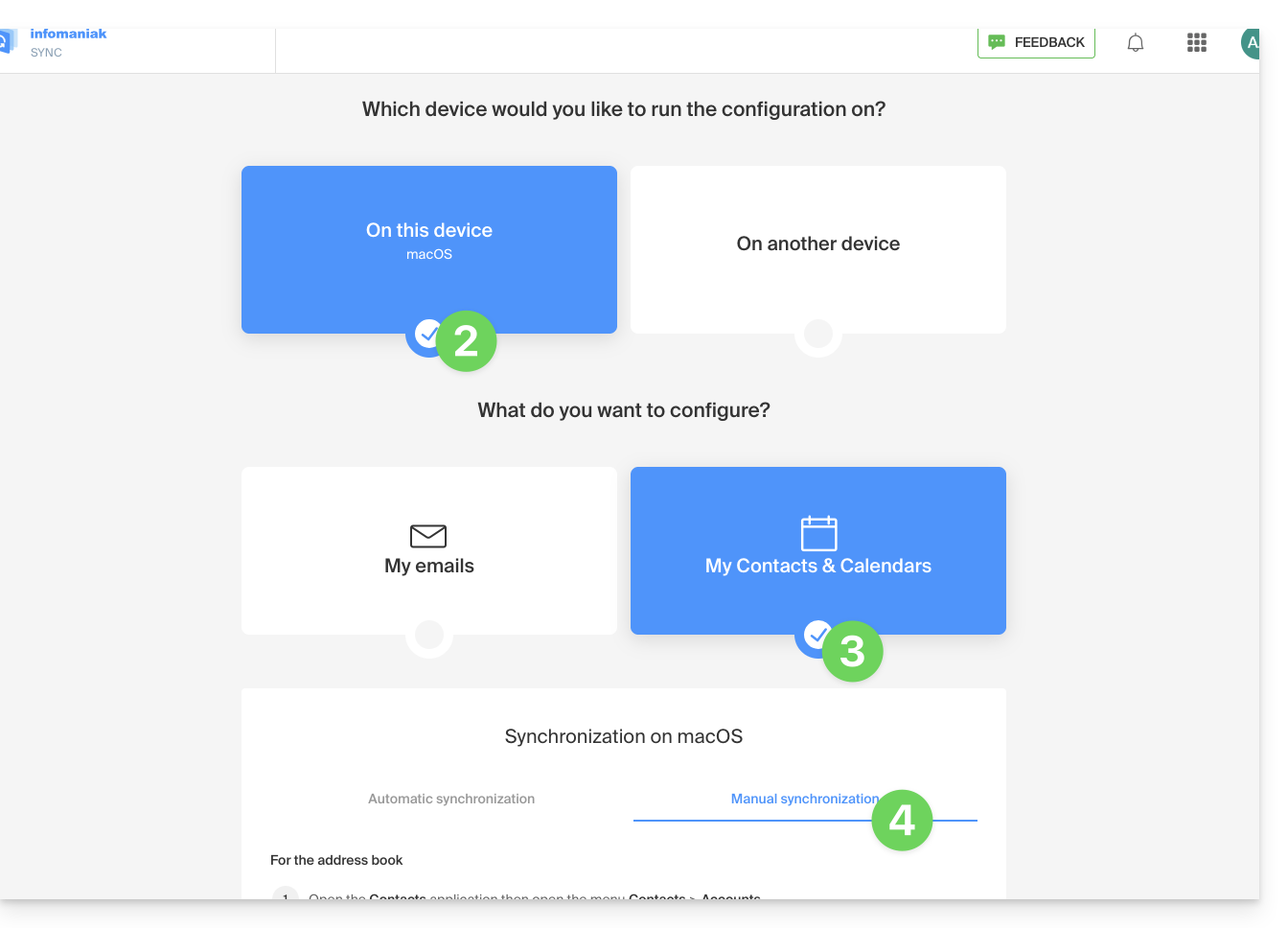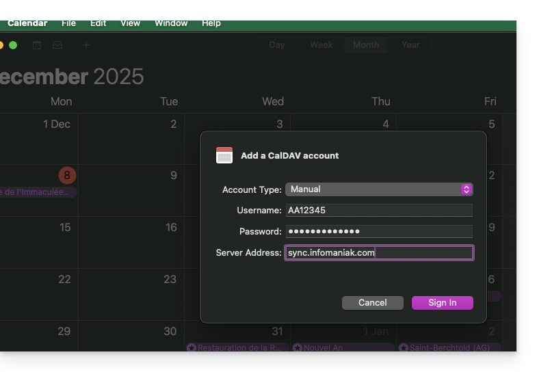Esta guía explica cómo conectar las aplicaciones de escritorio Contactos y Calendario (aplicaciones de escritorio en macOS) con los contactos y calendarios alojados en Infomaniak.