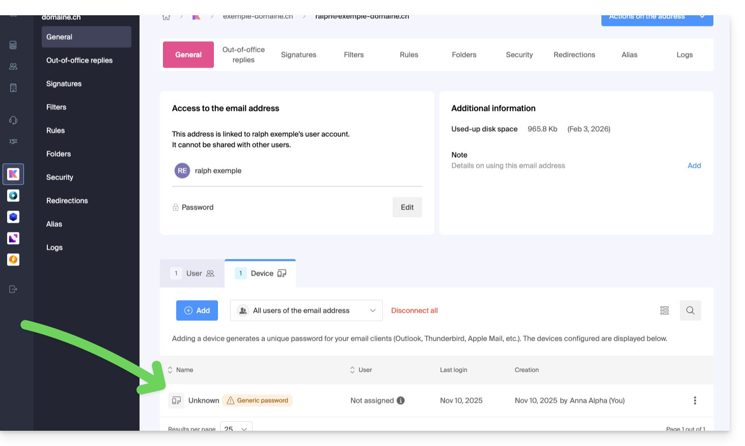 Para cortar cualquier conexión IMAP/POP/SMTP que se realice actualmente mediante una contraseña generada en esta interfaz (esto no elimina la dirección de la aplicación web Correo de Infomaniak (servicio en línea ksuite.infomaniak.com/mail) — debe administrar los usuarios de la dirección de correo electrónico para esto), es posible revocar un dispositivo, o incluso eliminar todas las configuraciones existentes en 1 clic: