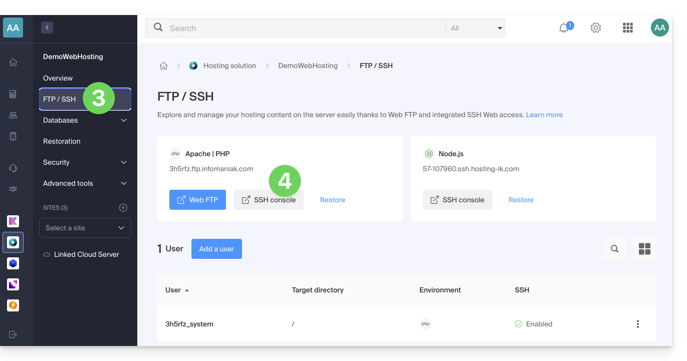 - Haga clic aquí para acceder a la gestión de su alojamiento en el Gestor Infomaniak (¿necesita ayuda?).