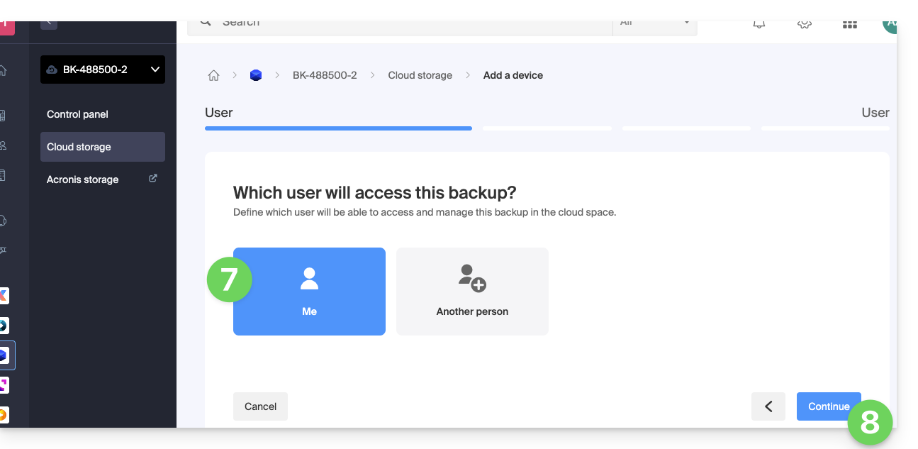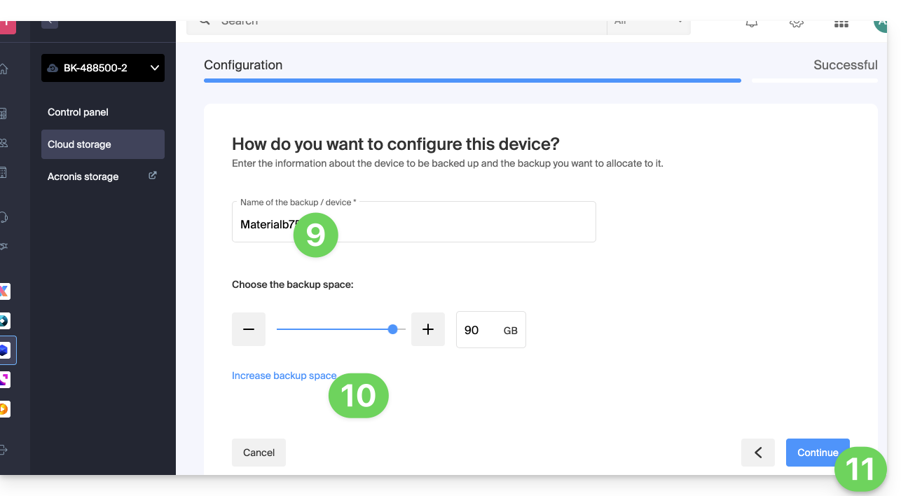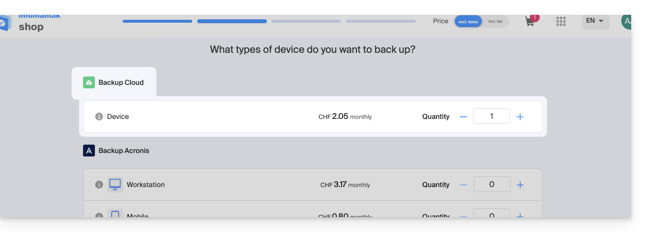 - Al realizar el pedido, haber definido la cuota de dispositivo(s) disponible(s) (mínimo 1) bajo copia de seguridad tipo Cloud: