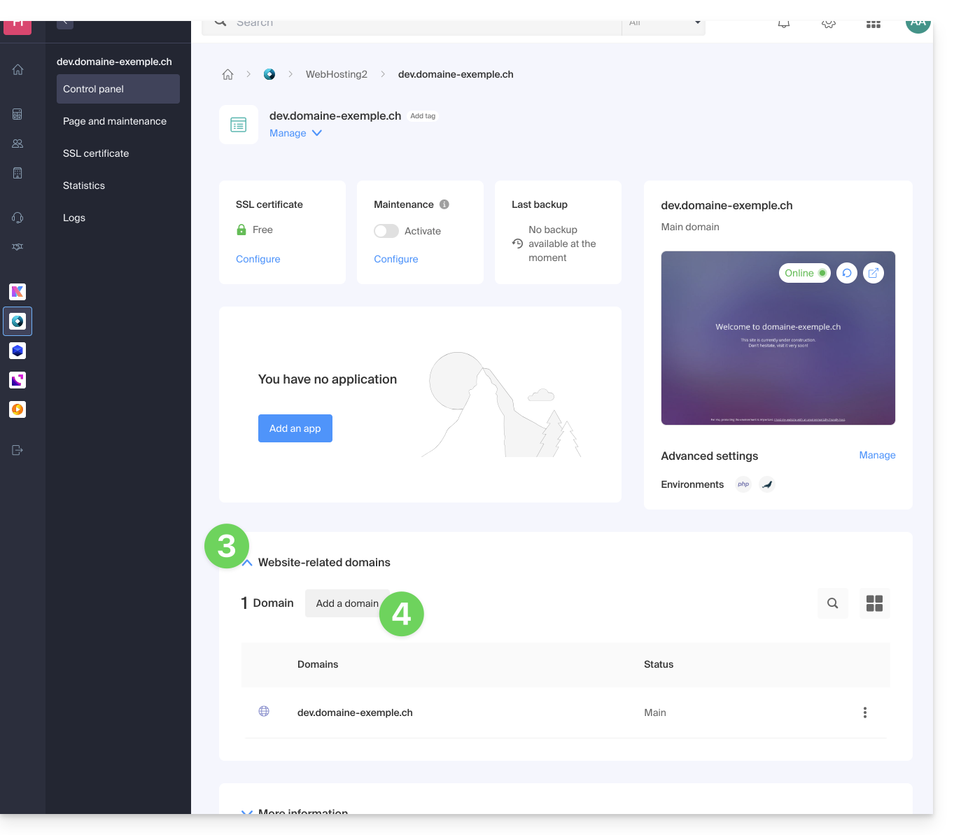 Aquí están las operaciones detalladas para pasar de un sitio con una dirección de tipo subdominio a una dirección directa (aquí dev.domaine-exemple.ch se convierte en domaine-exemple.ch):