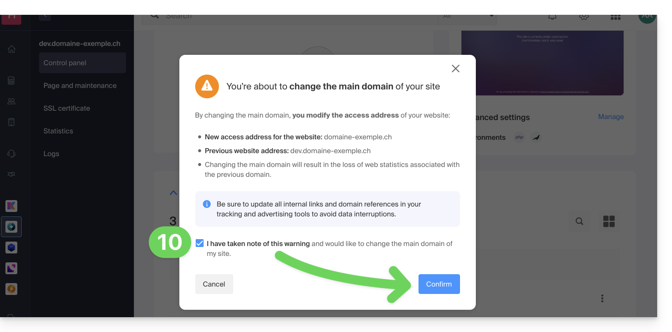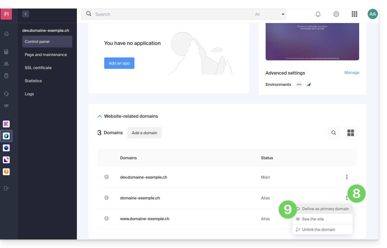 Esta guía explica cómo reemplazar, dentro de un hosting web de Infomaniak, la dirección de un sitio actualmente subdominio (https://dev.domain.xyz) por el dominio principal (https://domain.xyz).