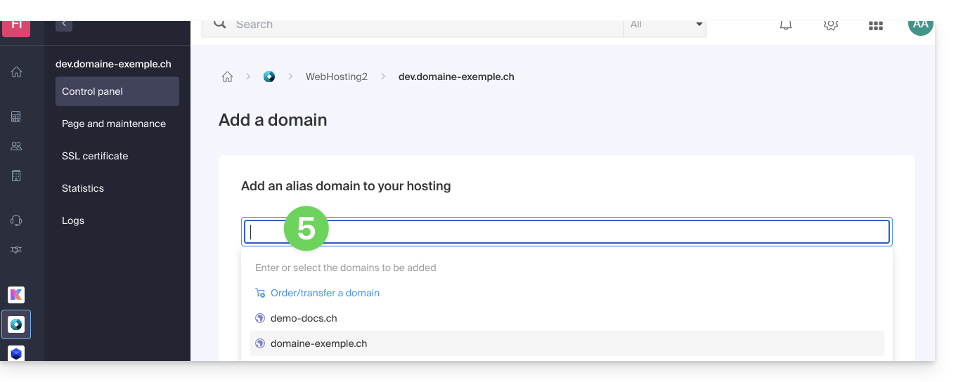 - Agregue el nuevo nombre deseado (si el nombre de dominio a agregar se encuentra en la misma Organización, se le propondrá en la lista, de lo contrario, ingrese su ortografía):