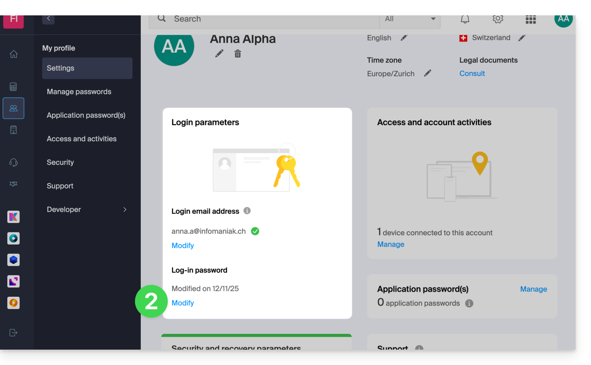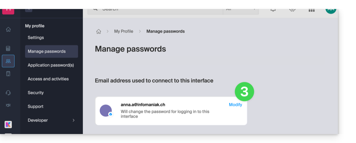 Esta guía explica cómo modificar la contraseña de su cuenta Infomaniak (= cuenta de usuario) en el Manager, la interfaz de administración de sus productos Infomaniak.