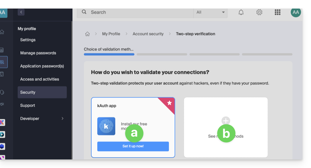- Una vez activada la funcionalidad, los usuarios de la Organización que aún no hayan activado la 2FA reciben un mensaje (a partir de la próxima acción en su cuenta) que les invita a configurar un método de autenticación adicional entre los propuestos e impidiéndoles realizar cualquier otra acción antes de esta: