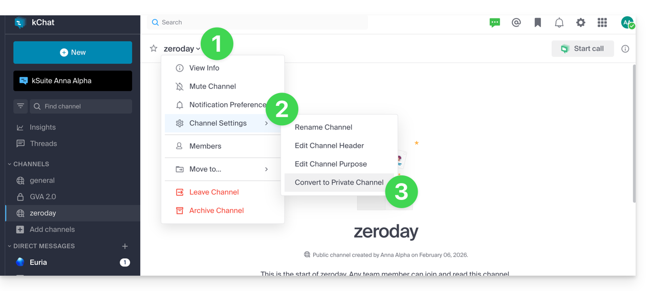 - Haga clic aquí para acceder a la aplicación web kChat (servicio en línea ksuite.infomaniak.com/kchat) o abra la aplicación de escritorio kChat (aplicación de escritorio en macOS / Windows / Linux).