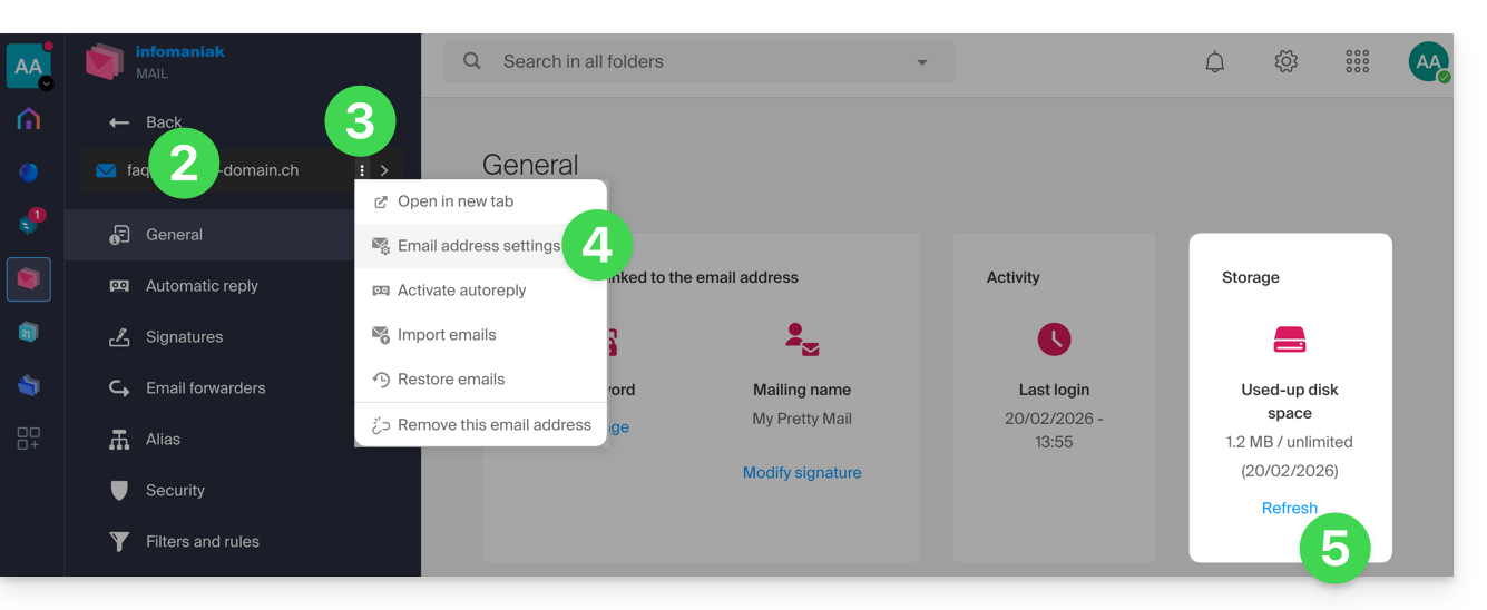 Esto no puede suceder con las direcciones de correo electrónico gestionadas por Infomaniak, ya que estas no tienen límite de tamaño de almacenamiento.