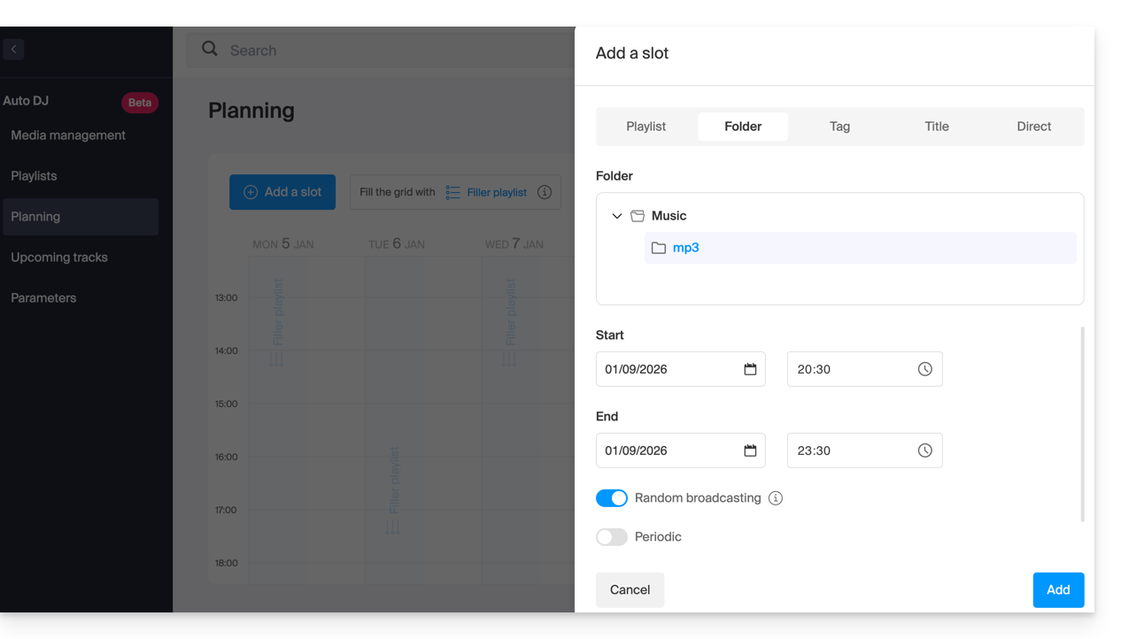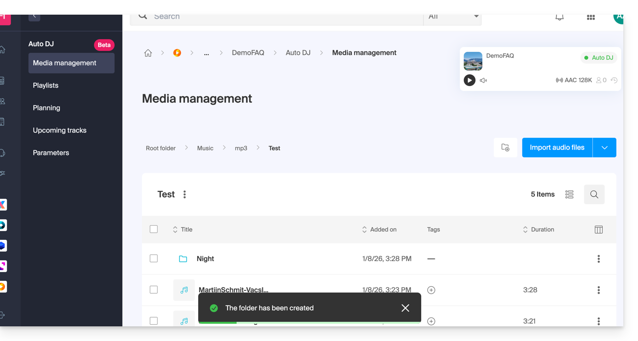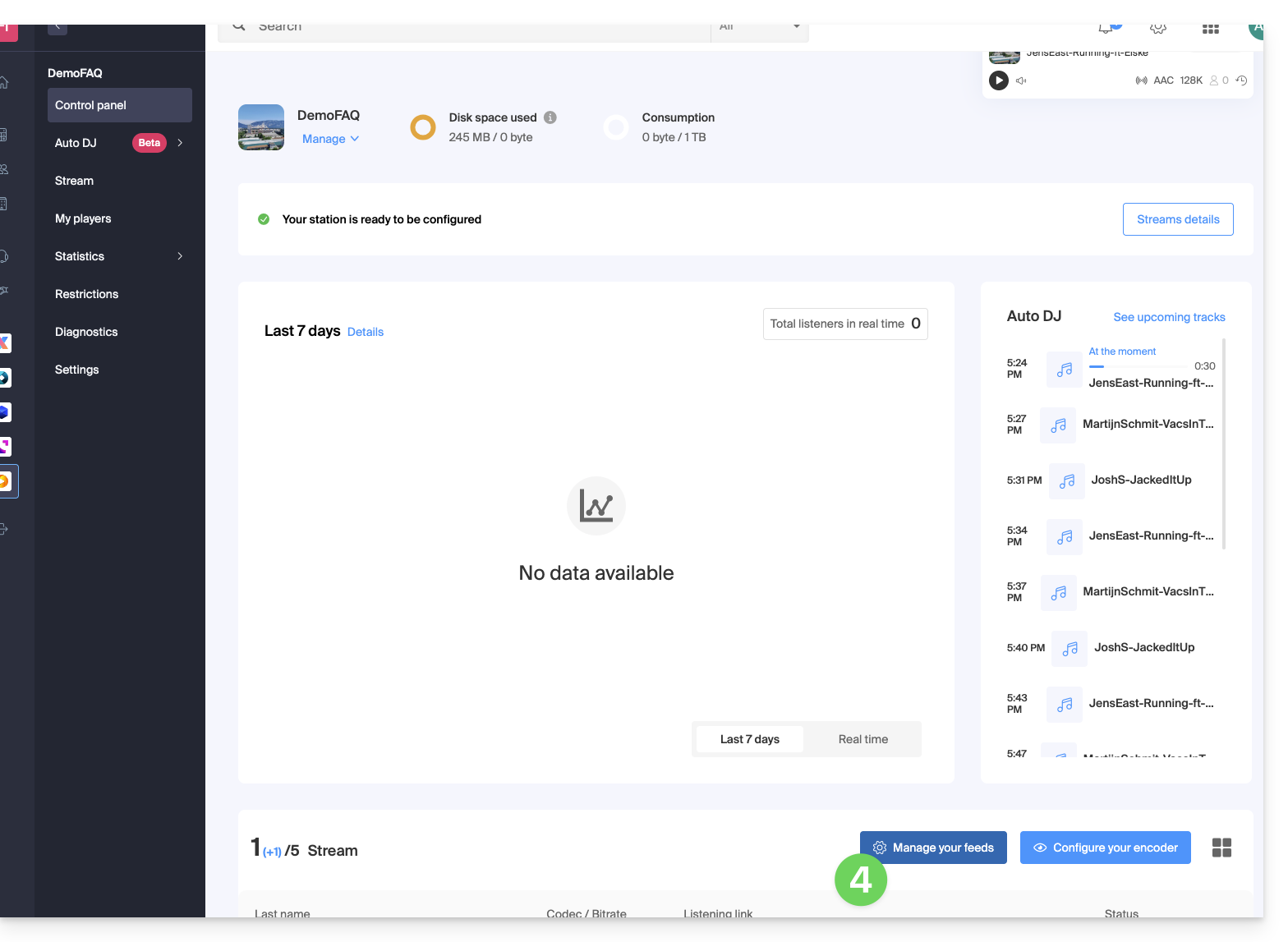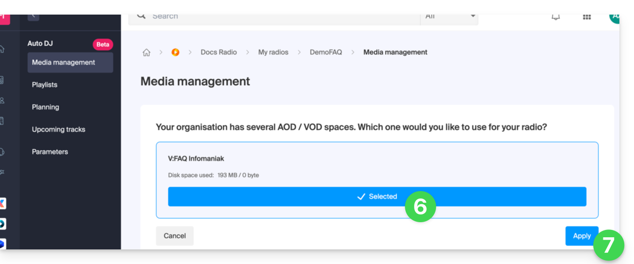 - El Auto DJ se basa en los archivos almacenados en su espacio AOD (Audio bajo demanda) de Infomaniak para crear un flujo lineal.