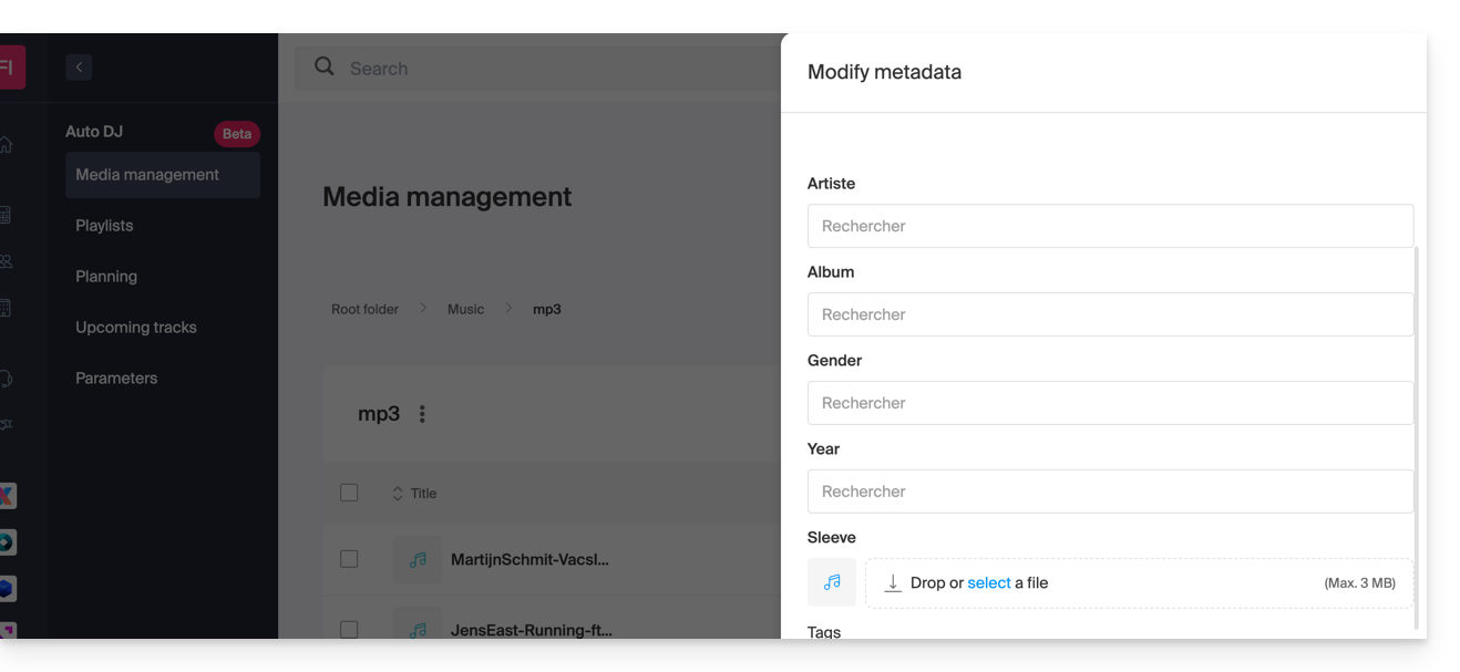 Es posible modificar directamente las etiquetas ID3 (título, artista, álbum, portada) desde la interfaz para que estas informaciones se muestren correctamente en sus reproductores: