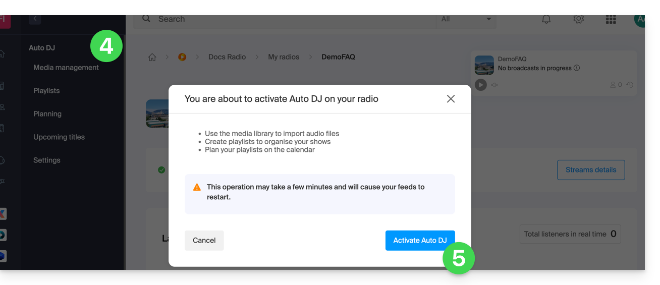 - Tome nota de las advertencias y haga clic en el botón para Activar Auto DJ cuando esté listo:
