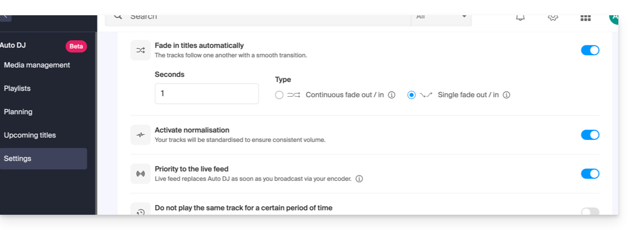 - Transición en vivo / AutoDJ: puede programar franjas horarias o automatizar la reanudación del flujo Auto DJ tan pronto como un codificador (fuente externa) deje de enviar su flujo.