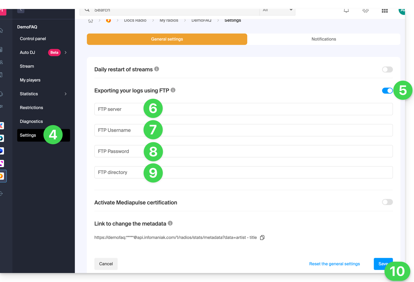 https://[flux]:[password]@api.infomaniak.com/1/radios/stats/metadata?data=artist - titleLa URL completa está disponible en la interfaz de administración: