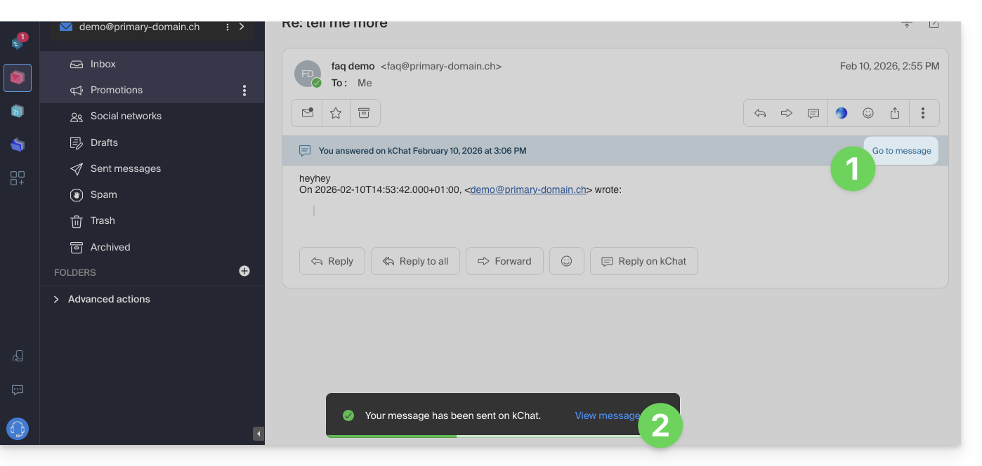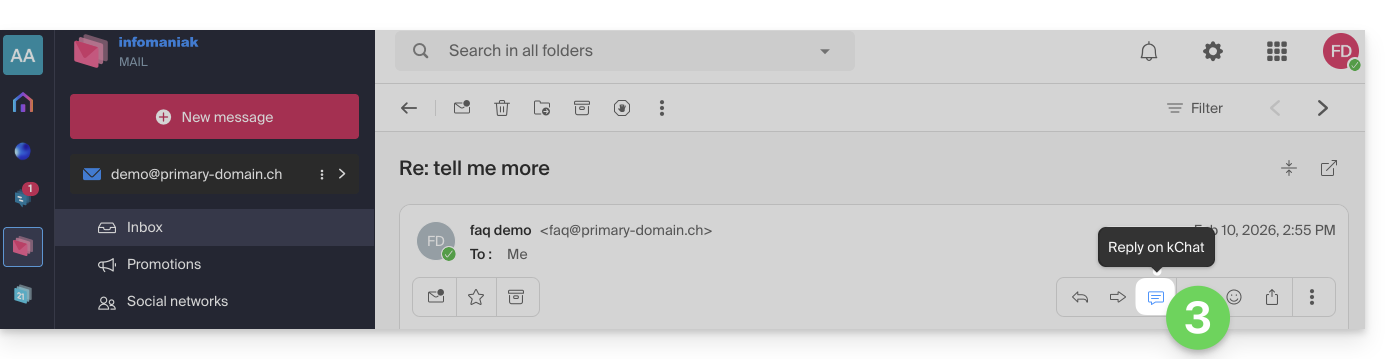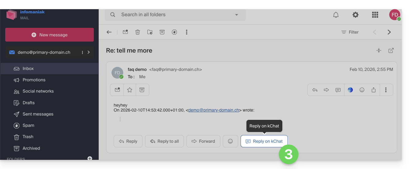 Esta guía explica cómo responder a un correo electrónico visible en la aplicación web Mail Infomaniak (servicio en línea ksuite.infomaniak.com/mail) enviando la respuesta directamente en la aplicación web kChat (servicio en línea ksuite.infomaniak.com/kchat) o la aplicación desktop, en forma de mensaje privado al remitente del correo electrónico.