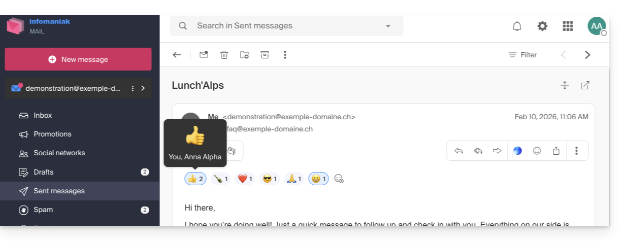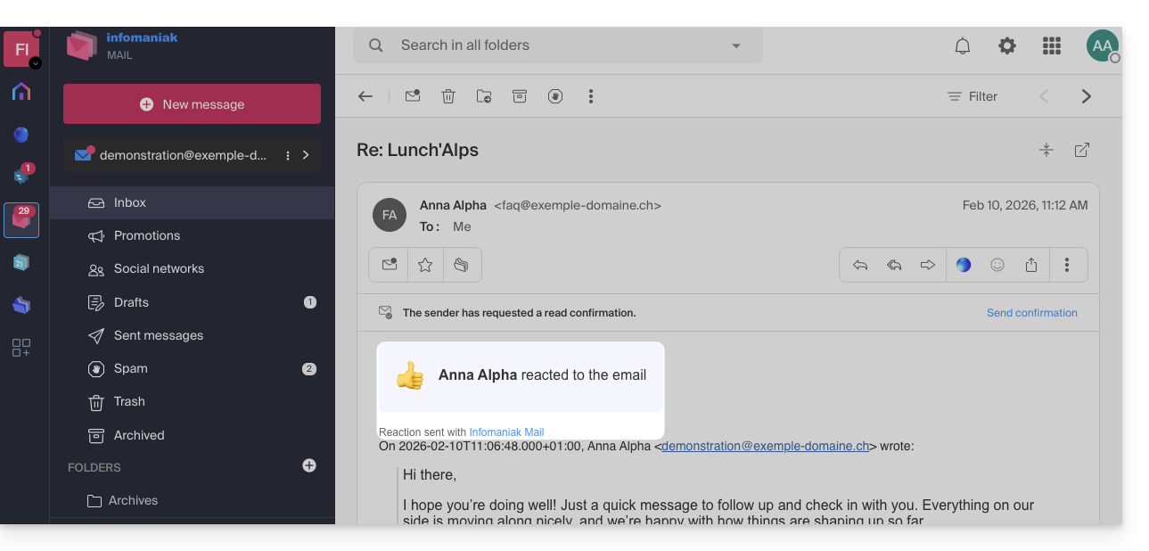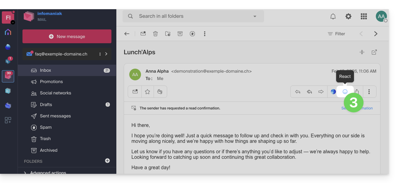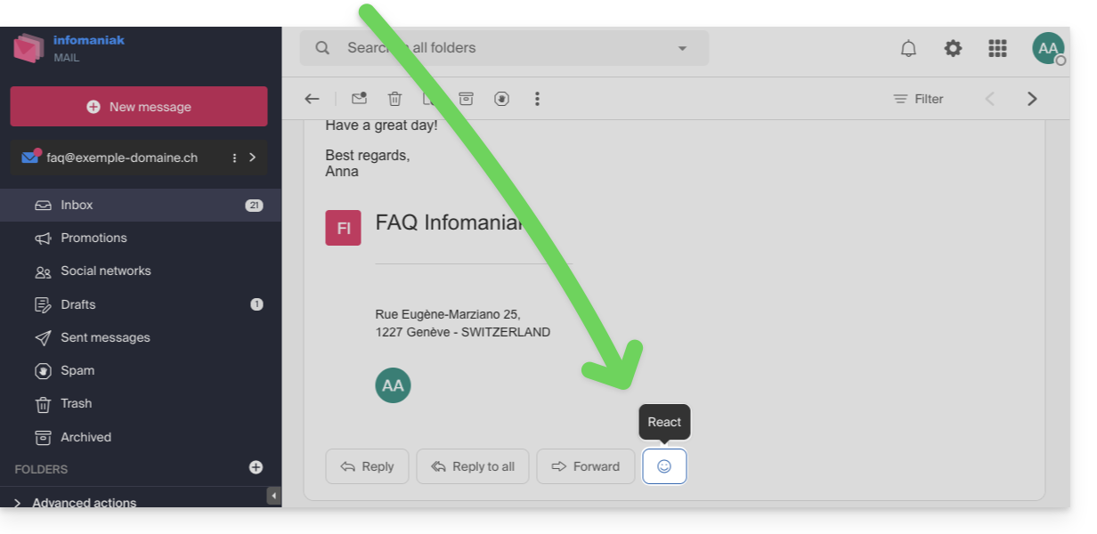 Esta guía explica cómo reaccionar rápidamente a un correo electrónico en la aplicación web Mail de Infomaniak (servicio en línea ksuite.infomaniak.com/mail).