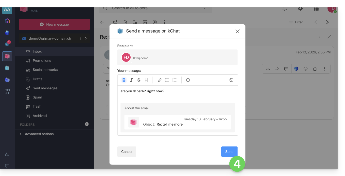 - Su interlocutor recibe el mensaje en kChat acompañado de un recuadro que representa el correo electrónico original (fecha y hora, asunto):