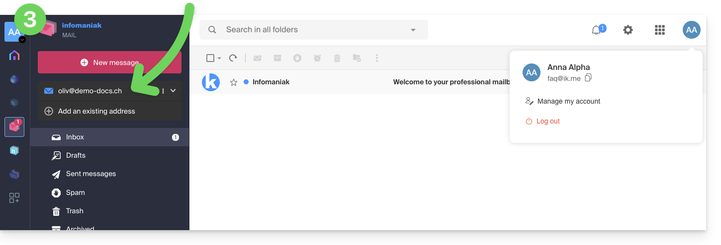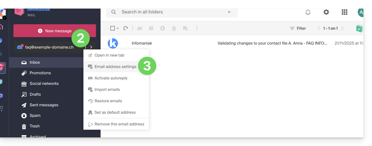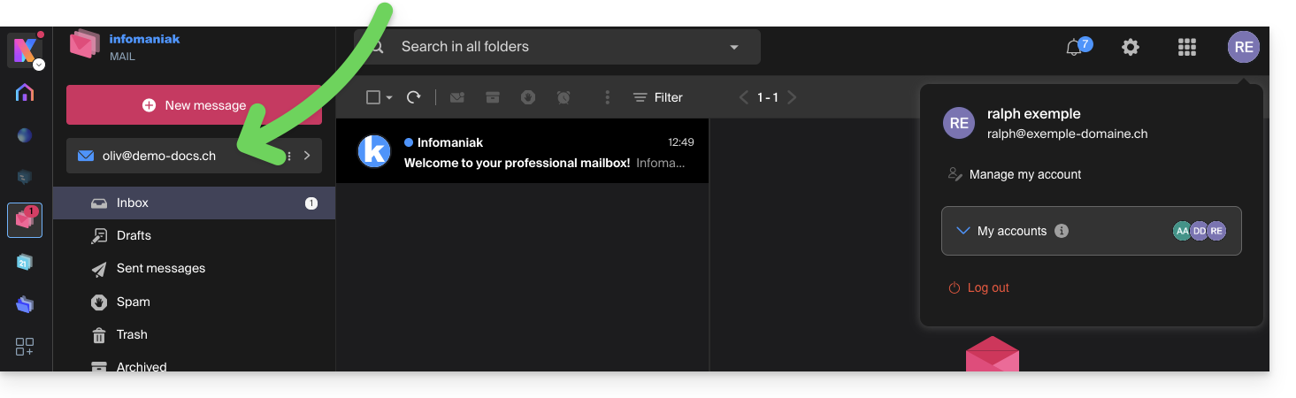 Pour accéder au même processus que ci-dessus mais depuis l'app Web Mail Infomaniak (service en ligne ksuite.infomaniak.com/mail):