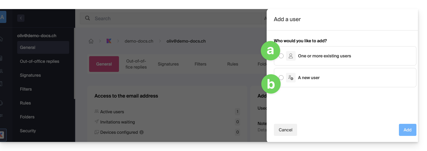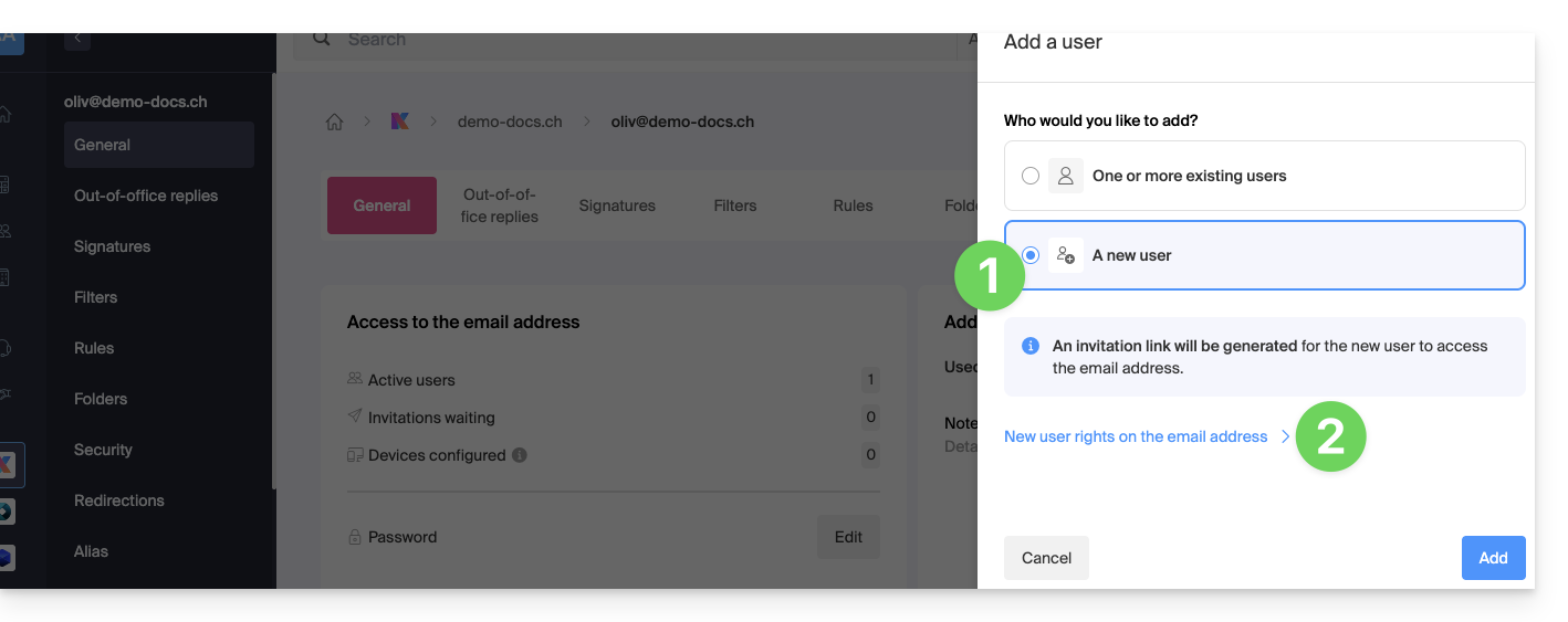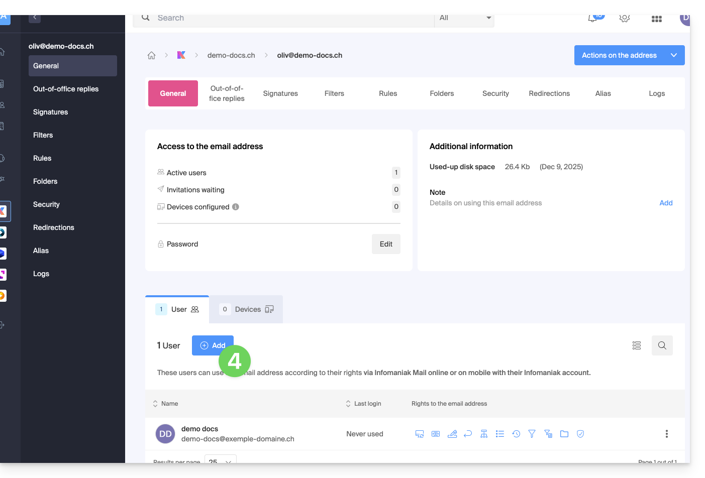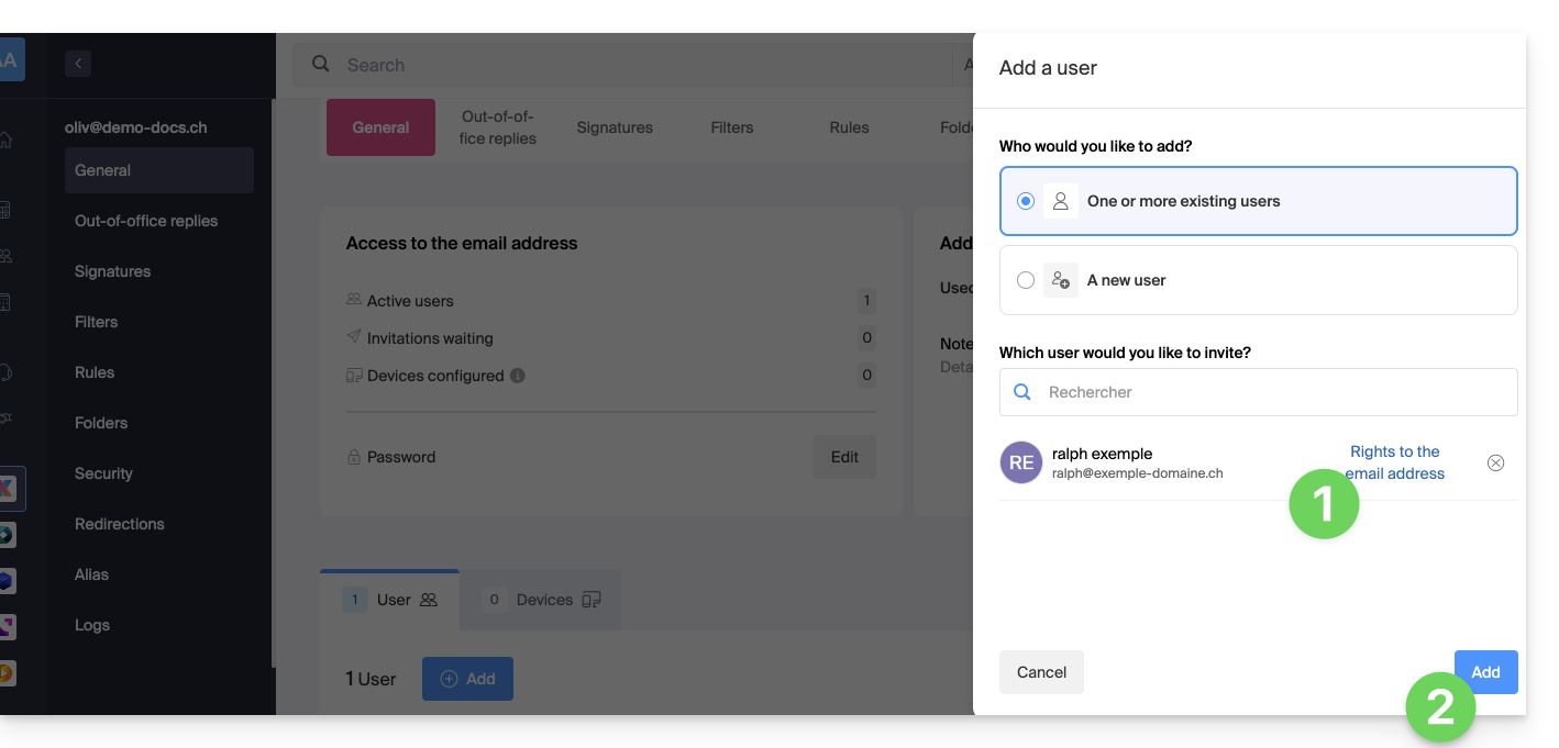 - Cliquez sur Ajouter au-dessus du tableau des utilisateurs ayant actuellement accès à l'adresse concernée sur Mail: