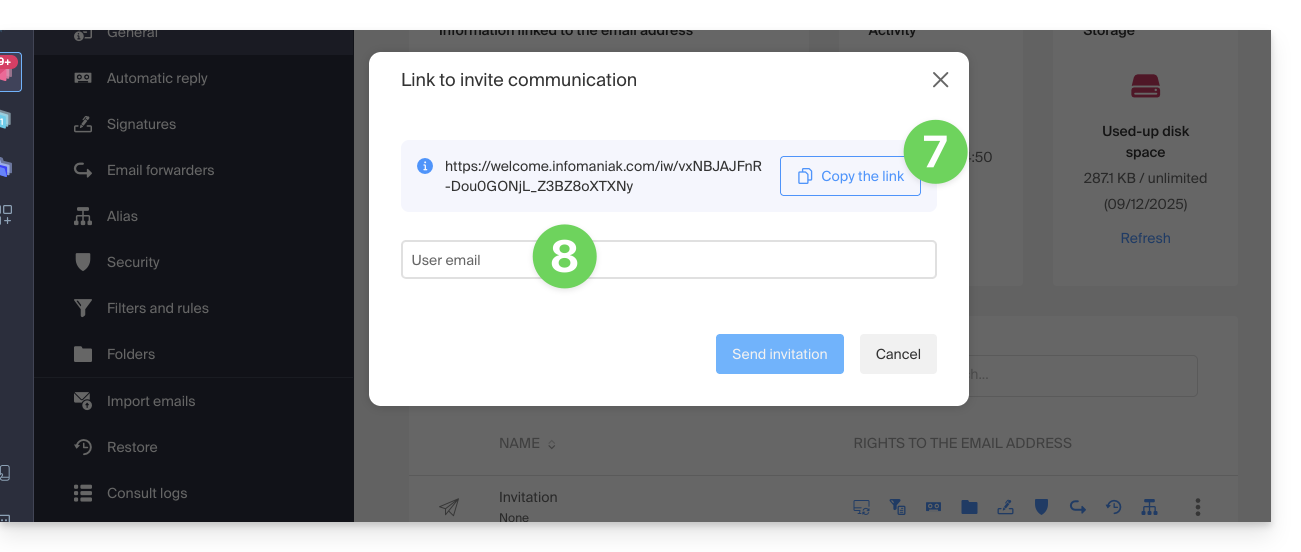 - L'invitation est créée et il suffira à l'utilisateur d'exécuter le lien proposé (lire ci-dessous) pour que l'adresse en question soit ajoutée à son Mail Infomaniak.