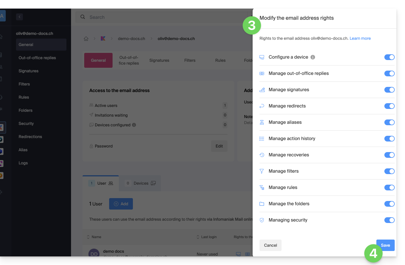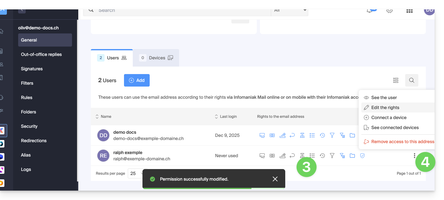 - Modifiez si nécessaire les permissions accordées à l'utilisateur pour l'adresse mail concernée.